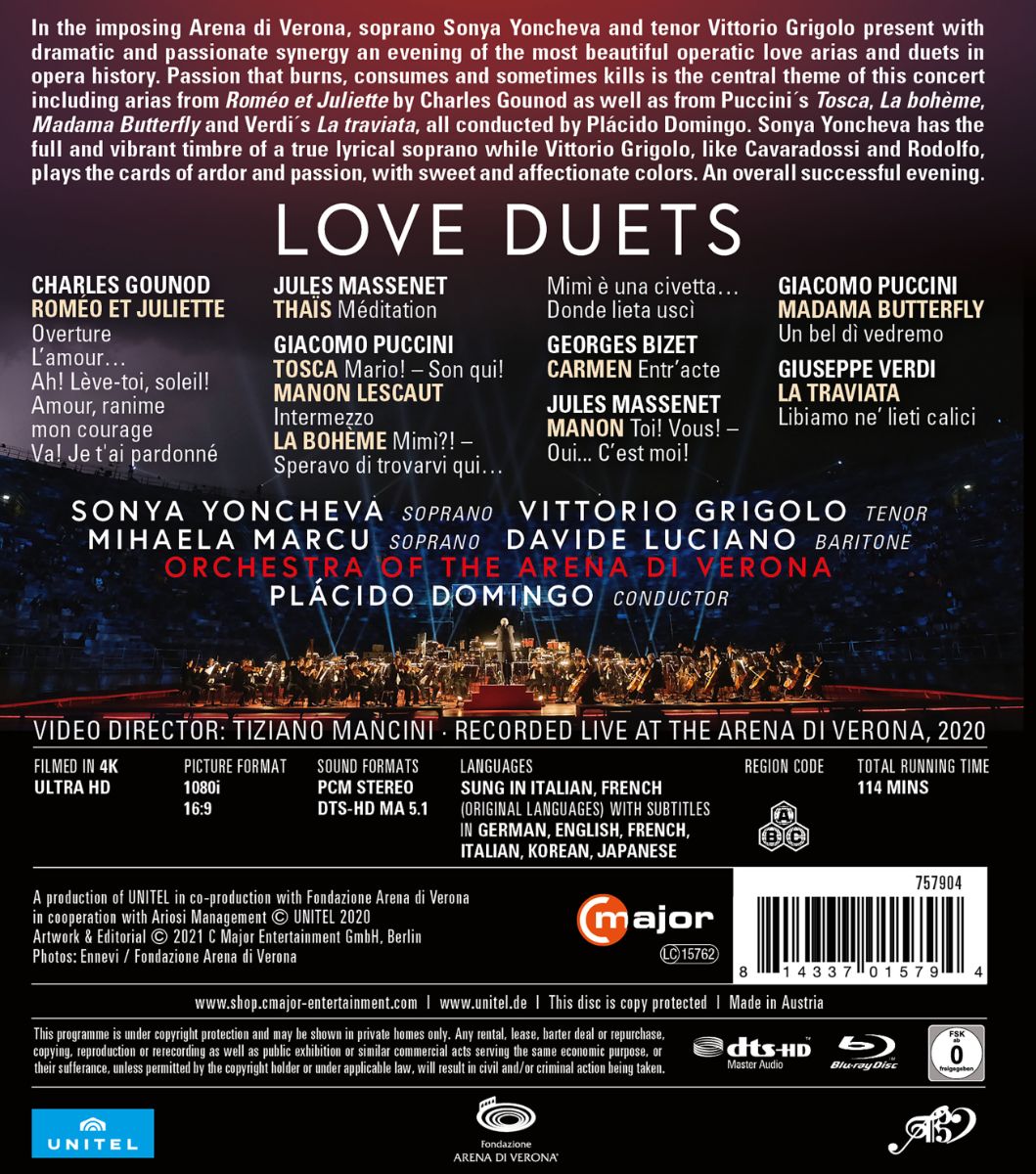 In der imposanten Arena di Verona präsentieren die Sopranistin Sonya Yoncheva und der Tenor Vittorio Grigolo in leidenschaftlicher Verbundenheit einen Abend mit einigen der schönsten Liebesarien und Duette der Operngeschichte. Leidenschaft, die brennt, verzehrt und manchmal tötet, ist das zentrale Thema dieses Konzerts mit Highlights aus Gounods „Roméo et Juliette“, Puccinis „Tosca“, „La bohème“ und „Madama Butterfly“ sowie Verdis „La traviata“. Das Orchester wird von niemand geringerem als Plácido Domingo geleitet.