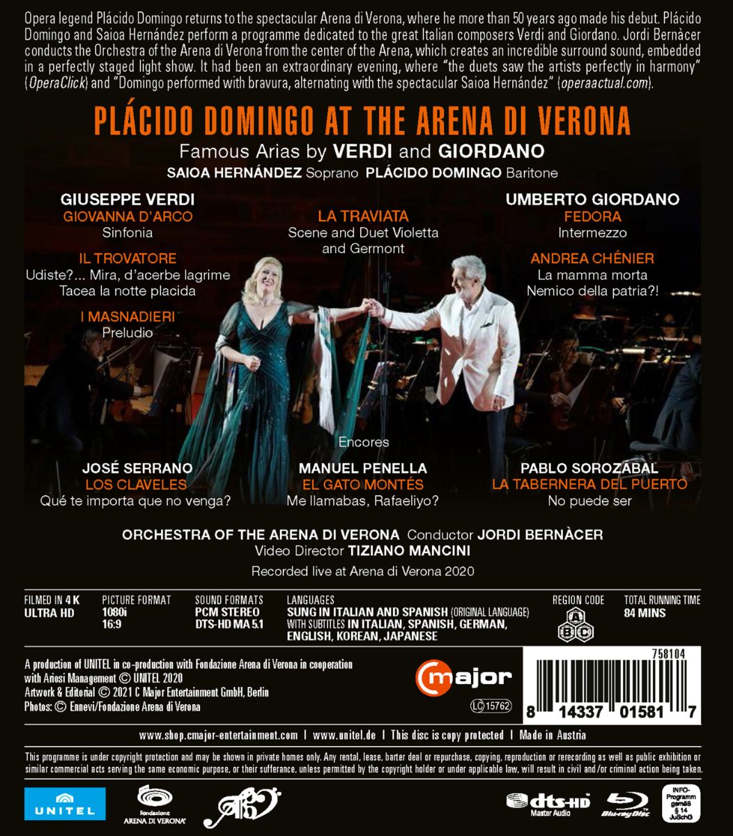 Seit über 50 Jahren ist Plácido Domingo ein gern gesehener Gast in der Arena di Verona. Seine zahllosen Auftritte im beeindruckenden römischen Amphitheater haben sicher in nicht unerheblichen Maße zu seinem weltweiten Ruhm beigetragen. Im Corona-Sommer 2020 gab Plácido Domingo gemeinsam mit der Sopranistin Saioa Hernández ein Programm, das den großen italienischen Komponisten Giuseppe Verdi und Umberto Giordano gewidmet war. Die coronabedingten Beschränkungen hatten bei diesem Konzertabend etwas Gutes: Die Bühne konnte im Zentrum der Arena aufgebaut werden, was eine perfekt inszenierte Lichtshow und einen beeindruckenden Raumklang erzeugte.
