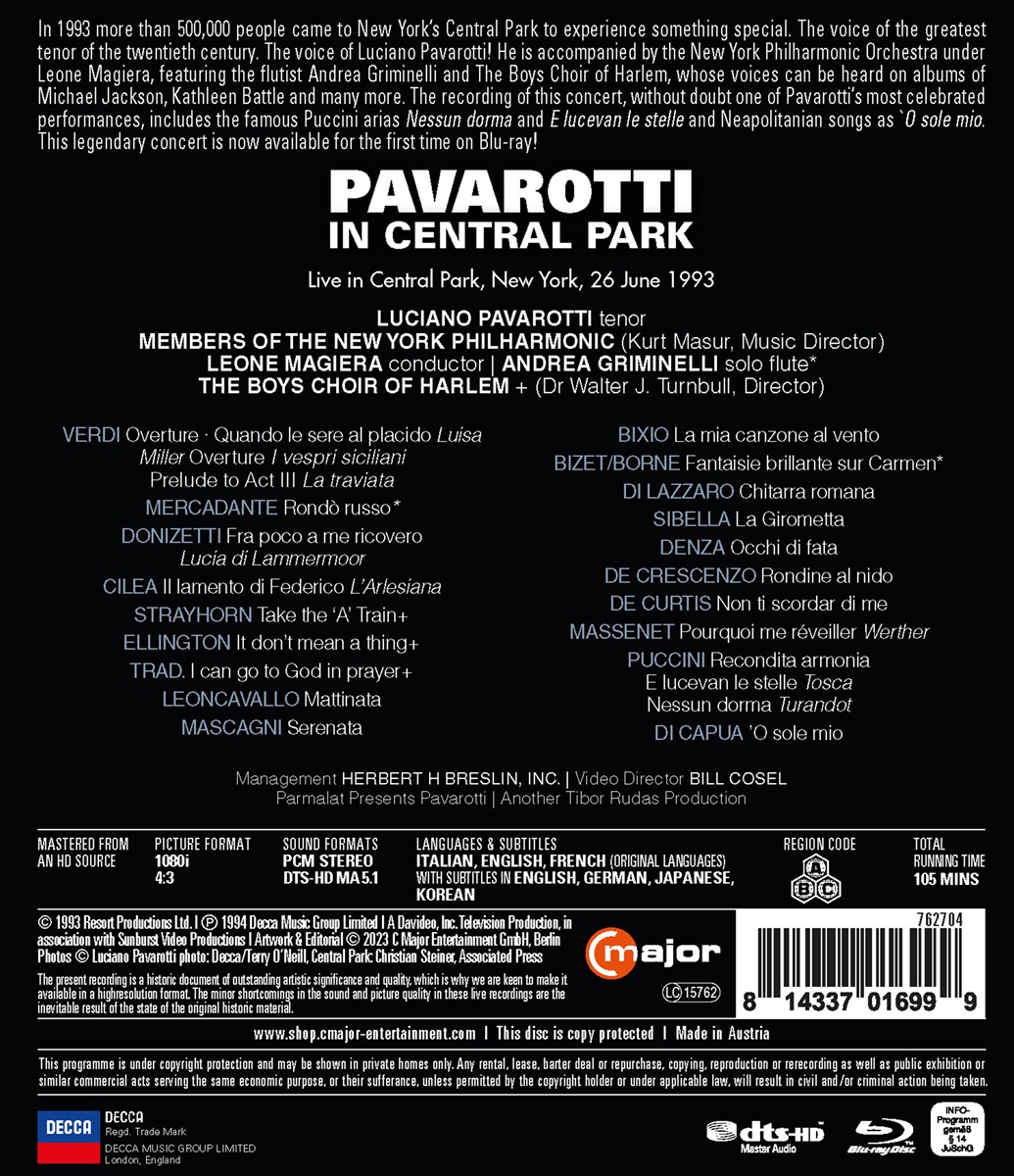Als sich am 26. Juni 1993 mehr als 500.000 Menschen im New Yorker Central Park versammelten, wollten sie nur eins: die Stimme des größten Tenors des 20. Jahrhunderts hören, Luciano Pavarottis Stimme. Ein Jahr zuvor hatte Pavarotti eine Menschenmenge im Londoner Hyde Park begeistert und hier in New York bewies er ein weiteres Mal, dass er ein Weltstar war. Er wurde vom New York Philharmonic Orchestra unter Leone Magiera begleitet sowie vom Flötisten Andrea Griminelli und The Boys Choir of Harlem, dessen Stimmen auch auf Alben von Michael Jackson, Kathleen Battle und vielen anderen Künstlern zu hören sind. Die Aufnahme dieses Konzertes enthält die berühmten Puccini-Arien „Nessun dorma“, „E lucevan le stelle“ und neapolitanische Lieder wie „O sole mio“.
