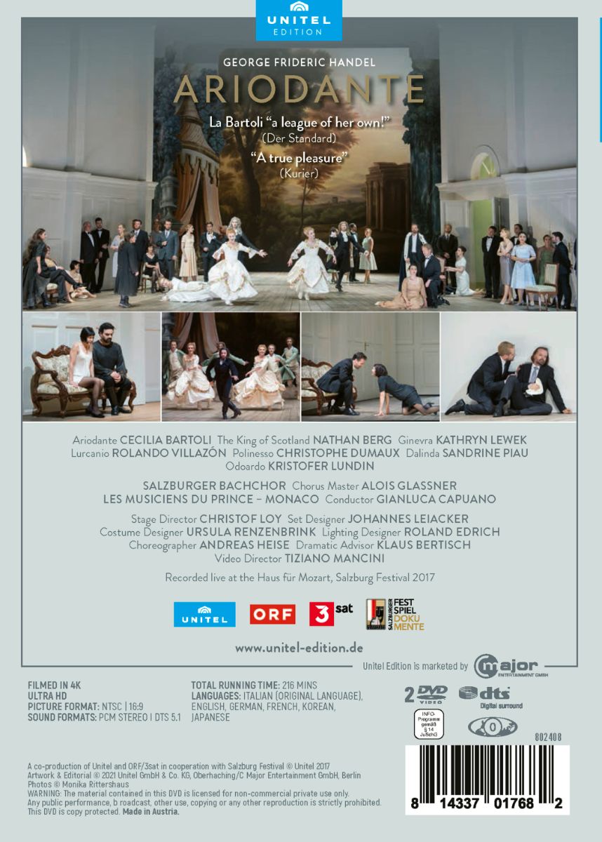 Bei den Salzburger Festspielen 2017 glänzte Cecilia Bartoli als Ariodante mit ihren schillernden Koloraturen in einer hochgelobten Neuinszenierung von Regisseur Christoph Loy, der für seine klugen psychologischen Inszenierungen bekannt ist. Loy macht aus Händels prächtiger Barockoper eine spannende und differenzierte Auseinandersetzung mit den Geschlechterrollen. Ein hochkarätiges Ensemble, allen voran die stets brillante Cecilia Bartoli in der Hosenrolle des Ritters Ariodante, die mühelos zwischen heiterem und klagendem Virtuosen-Gesang wechselt, macht die Inszenierung zu einem wahren Triumph. An ihrer Seite agieren Publikumsliebling Rolando Villazón als Lurcano und die junge amerikanische Sopranistin Kathryn Lewek, von der Kritik als Entdeckung gepriesen.