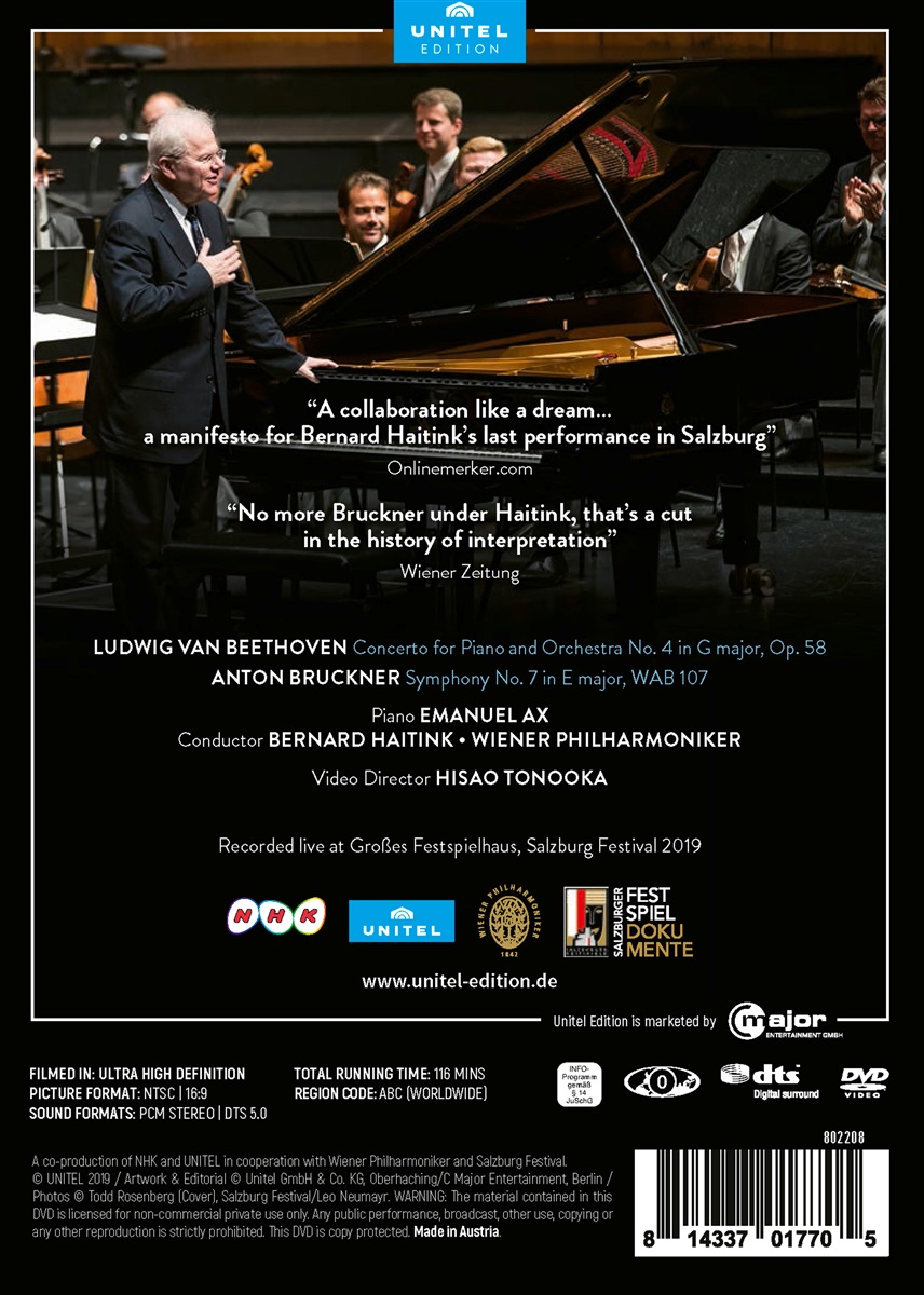 Der niederländische Dirigent, der kurz vor dem Konzert zum Ehrenmitglied der Wiener Philharmoniker ernannt wurde, eröffnete das Konzert zusammen mit dem Starpianisten Emanuel Ax mit Beethovens Klavierkonzert Nr. 4; krönender Abschluss war dann im zweiten Teil Bruckners monumentale Sinfonie Nr. 7, die den endgültigen Durchbruch des Komponisten markierte und nach wie vor eine seiner beliebtesten Sinfonien ist. Die Wiener Philharmoniker spielen unter Haitinks meisterhaftem Dirigat konzentriert, dynamisch und mit tiefster Empfindung. Die Atmosphäre dieser letzten Aufführung war ohne Zweifel außergewöhnlich, und ein sichtlich emotionaler Haitink wurde vom Publikum mit lang anhaltenden Ovationen gefeiert.