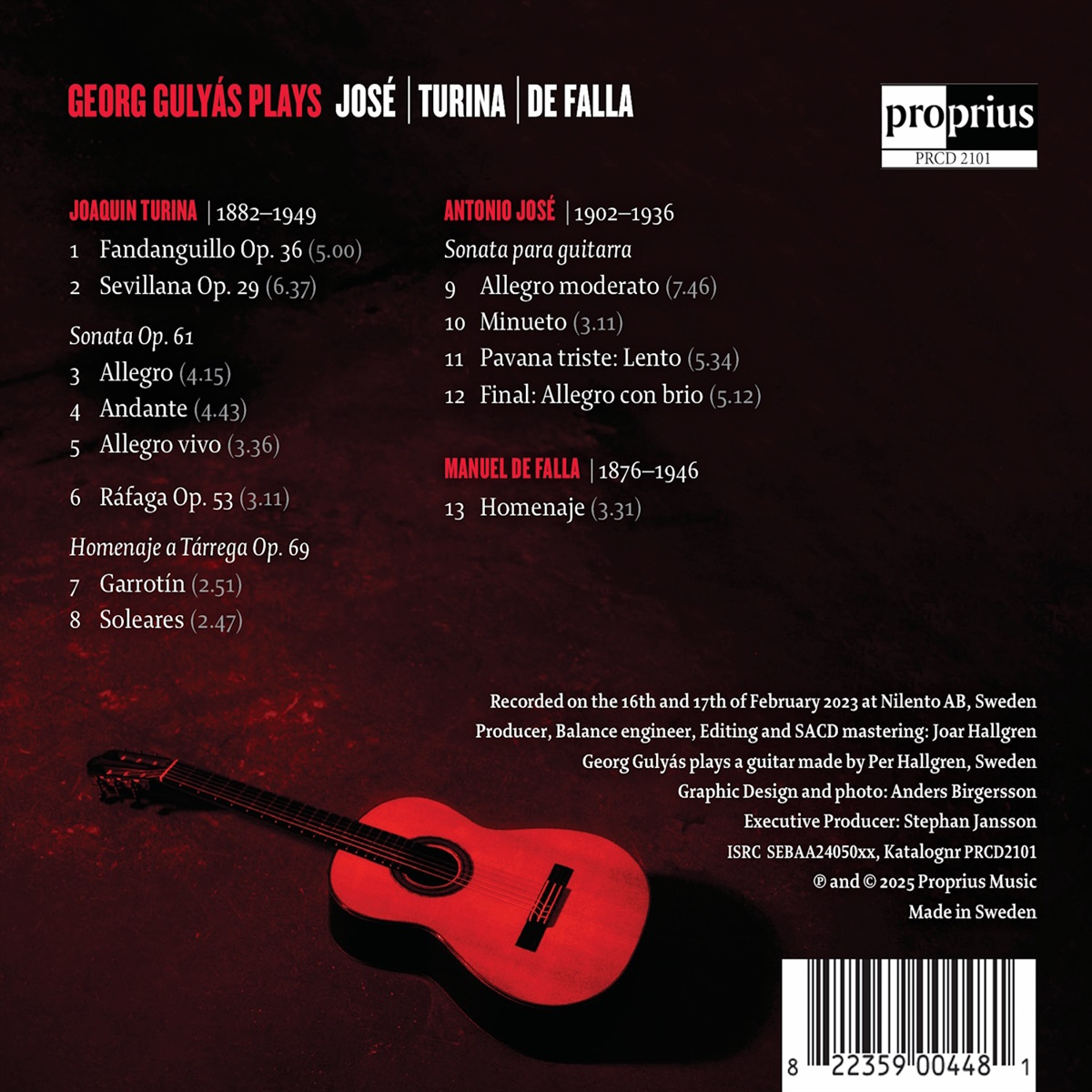 Georg Gulyás' achtes Album auf Proprius enthält spanische Musik des frühen 20. Jahrhunderts, bestehend ausschließlich aus Werken für Sologitarre von Joaquín Turina, Antonio José und Manuel de Falla. Sein voriges Album mit der Gitarrenmusik des lateinamerikanischen Komponisten Heitor Villa-Lobos wurde bei seiner Veröffentlichung im Jahr 2023 von der Kritik gelobt.