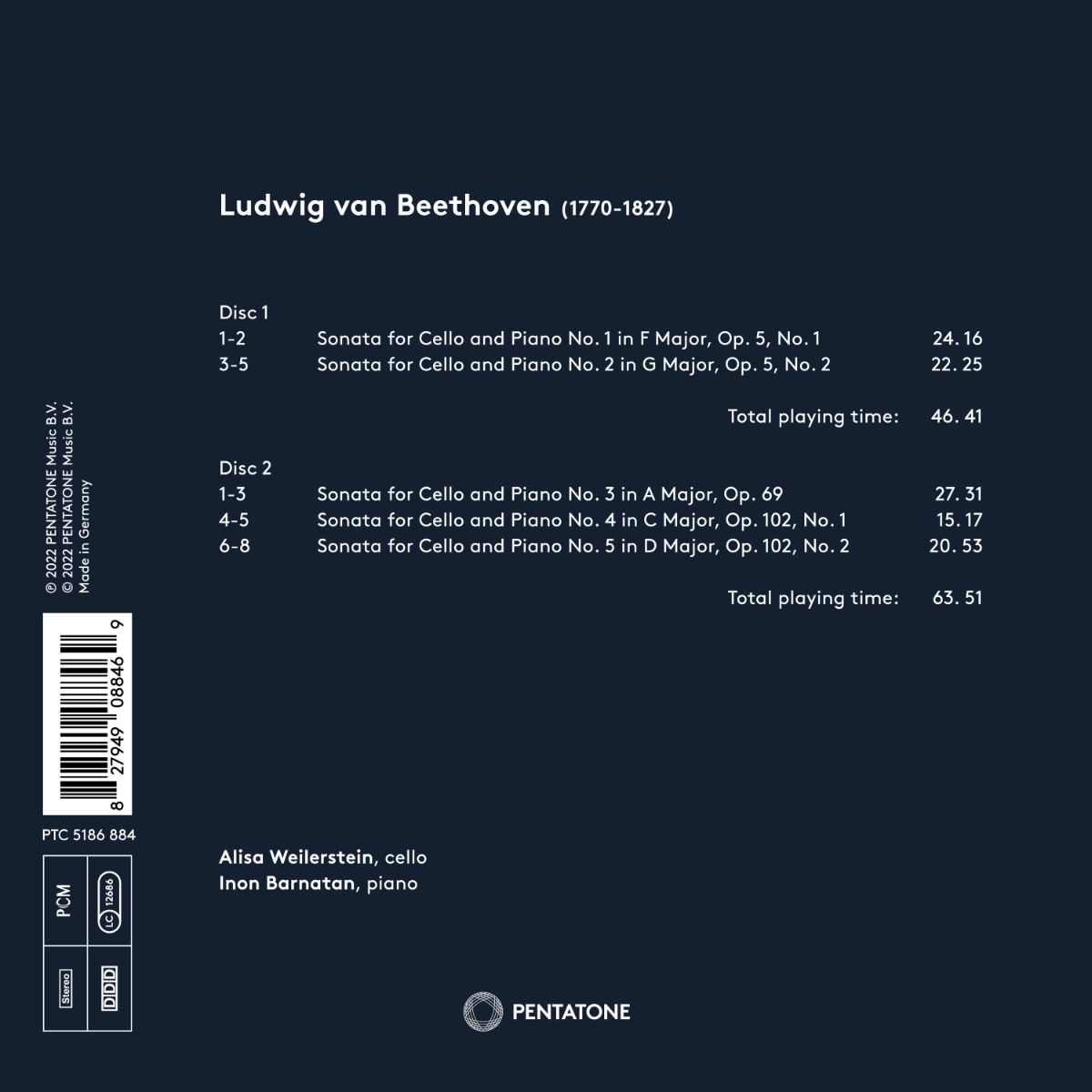 enthalten nicht nur einige der reizvollsten und lyrischsten Melodien, die Beethoven schrieb, sondern ermöglichen es dem Hörer auch, die außergewöhnliche künstlerische Entwicklung des großen Meisters nachzuvollziehen. Die dritte Sonate ist zudem ein Wendepunkt in der Sonatenliteratur, da sie Cello und Klavier wohl zum ersten Mal in der Geschichte des Komponisten als völlig gleichberechtigte Partner nebeneinander stellt. Der Reichtum dieser Werke kommt in der Interpretation von Weilerstein und Barnatan voll zur Geltung, die sich - neben ihren glorreichen Solokarrieren - auch als eines der kongenialsten Kammermusik-Tandems unserer Zeit erwiesen haben.
