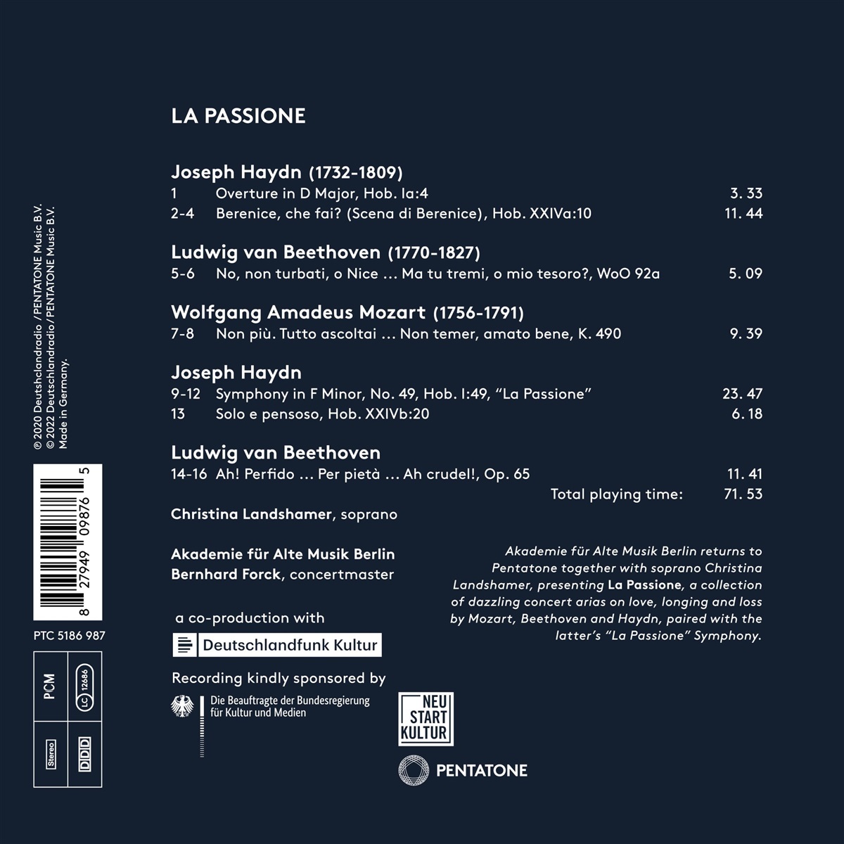 Mit 'La Passione' präsentieren die Sopranistin Christina Landshamer und die Akademie für Alte Musik Berlin ein Programm schillernder Konzertarien über Liebe, Sehnsucht und Verlust von Mozart, Beethoven und Haydn, kombiniert mit dramatischen Orchesterwerken. Die Sammlung reicht von pastoraler Schlichtheit bis zu ausgelassener Überschwänglichkeit und fasst Beethovens wenig bekannten Ausflug in die italienische Bravour-Oper, einen Geniestreich aus Mozarts 'Idomeneo', einige Haydn-Highlights und eine der dramatischsten und ausdrucksstärksten Sinfonien des 18. Jahrhunderts zusammen.