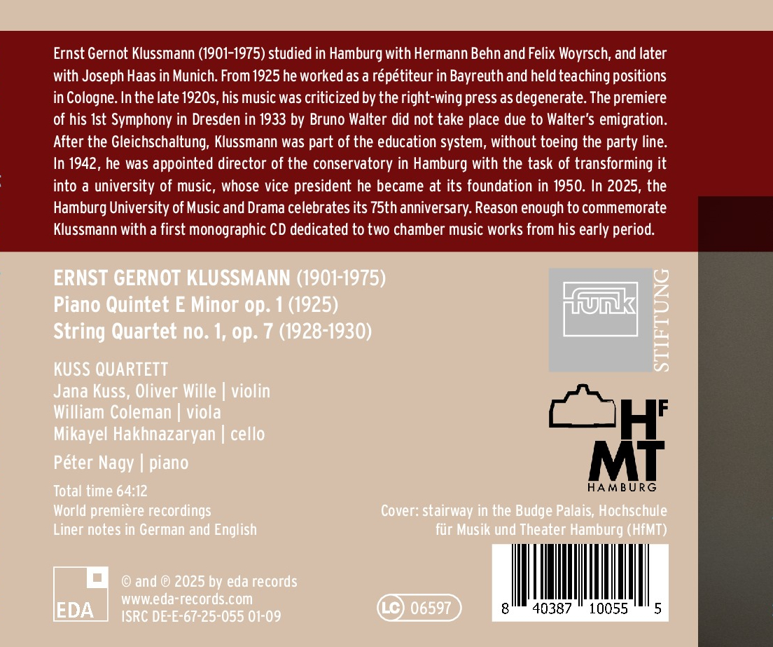 Dies ist die erste Einspielung überhaupt von Werken einer bedeutenden Persönlichkeit des Hamburger Musiklebens im 20. Jahrhundert: Ernst Gernot Klussmann. Die Einspielung entstand in Kooperation mit der Hamburger Funk Stiftung und der Hamburger Hochschule für Musik und Theater anlässlich ihres 75-jährigen Jubiläums. Ernst Gernot Klussmann (1901-1975) studierte in Hamburg bei Hermann Behn, dem Freund und Förderer Gustav Mahlers, sowie bei Felix Woyrsch, später bei Joseph Haas in München. Er wirkte danach als Korrepetitor in Bayreuth und übernahm später Stellen in Köln. 1942 wurde er nach Hamburg berufen als Direktor des dortigen Konservatoriums mit der Aufgabe, dieses zur wichtigsten Musikhochschule Norddeutschlands umzuwandeln. In den 1920er Jahren wurde seine Musik von der rechten Presse als entartet kritisiert, die geplante Uraufführung seiner 1. Sinfonie in Dresden 1933 durch Bruno Walter kam wegen dessen Emigration nicht zustande. Ab 1933 war Klussmann Teil des gleichgeschalteten Bildungssystems, ohne auf Parteilinie zu sein. Seit ihrer Gründung 1950 leitete er gemeinsam mit Philipp Jarnach die Geschicke der Hamburger Hochschule für Musik und Theater (HfMT) als deren Vizepräsident bis zu seiner Emeritierung. Die Feiern zum 75jährigen Bestehen der HfMT 2025 bieten den Anlass, eines ihrer Gründerväter zu gedenken mit Ersteinspielungen von zwei frühen Kammermusikwerken, die eindrucksvoll Klussmanns Weg von der Spätromantik zum Expressionismus aufzeigen; ein Weg, den er nach dem Krieg in intensiver Auseinandersetzung mit Arnold Schönberg weitergehen sollte. Das beliebte Kuss-Quartett interpretiert die Werke auf diesem Album.