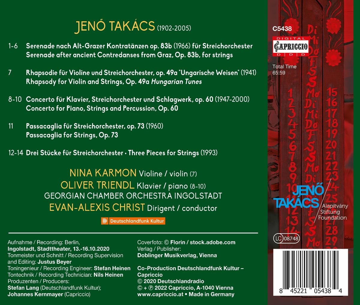Mit eigenen Werken wie dem Konzert für Klavier, Streichorchester und Schlagwerk und anderen auf diesem Album eingespielten Werken steht Jeno Takács würdig in die Nachfolge so großer Vorbilder wie Béla Bartók und Zoltán Kodály. Durch seine Bekanntschaft mit Bartók verstärkte sich der ungarische Einfluss (Thematik, Rhythmik und Bitonalität) in seinen Werken. Zu der impressionistischen Färbung und den Einflüssen ungarischer Volksmusik trat infolge seines Unterrichts bei Joseph Marx ebenso eine strenge kontrapunktisch-thematische Strömung hinzu.