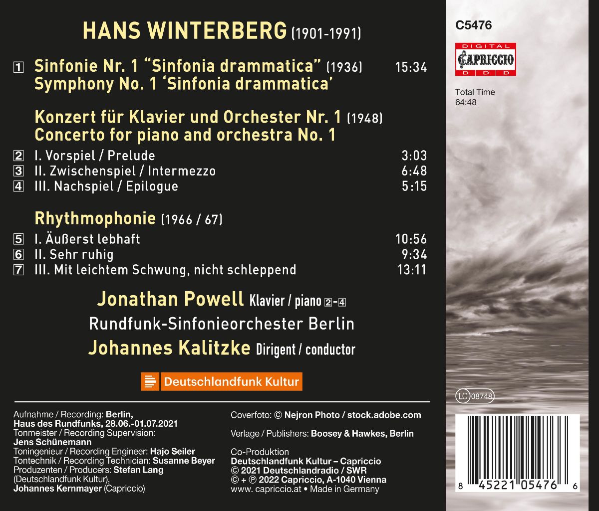 Hans Winterberg, aufgewachsen in der Prager Kaderschmiede der neuen tschechischen Musiktradition, gehört zu den wenigen überlebenden jüdischen Komponisten seiner Zeit. Er selbst verstand seine Musik als Brücke zwischen dem Westen und dem slawischen Osten. Sein Ausgangspunkt sei Schönberg, meinte er selbst, doch in der Tat pflegte er einen mitteleuropäischen Impressionismus, den er mit komplexen Rhythmen gekonnt zu mischen vermochte. Dieses Album bringt drei Orchesterwerke aus unterschiedlichen Schaffensperioden zu Gehör: die Sinfonie Nr. 1 (von 1936), das Klavierkonzert Nr. 1 (1948) und die „Rhythmophonie“ (1966/67).
