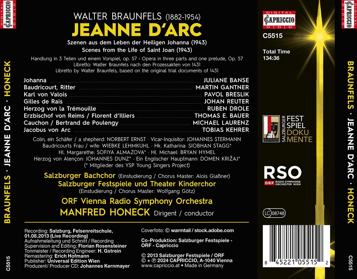 Walter Braunfels zählt zu den Komponisten, deren Musik zweimal starb. Einmal, als die Nationalsozialisten seine Kunst als „entartet“ deklarierten und nochmals, als der „ästhetische Paradigmenwechsel“ (Udo Zimmermann) nach dem 2. Weltkrieg die zeitgenössische tonale Musik an den Rand drängte. Die vorliegende, bereits 10. Veröffentlichung der ‚Braunfels Edition‘ bei Capriccio, stellt eines seiner berühmtesten Opernwerke in den Vordergrund. Was die „Jeanne D’Arc“ zu einem bemerkenswert effektiven Musikdrama macht, ist nicht nur die oft schwelgerische post- romantische Tonsprache, sondern auch Braunfels‘ selbst verfasstes Libretto. Die Geschichte selbst ist bekannt: Vision, Befreiung von Orleans, Krönung des Dauphins, Verhaftung, Inquisitionsprozess, und schließlich der Verbrennungstod. Braunfels schafft es, aus den originalen lateinischen und französischen Prozessunterlagen des 15. Jahrhunderts, einem Hauch George Bernard Shaw („Die heilige Johanna“), sowie seinen eigenen Hinzu-Dichtungen, diese Geschichte und ihre Protagonisten, trotz des unserer Zeit doch so fernen Sujets, wieder lebendig werden zu lassen.