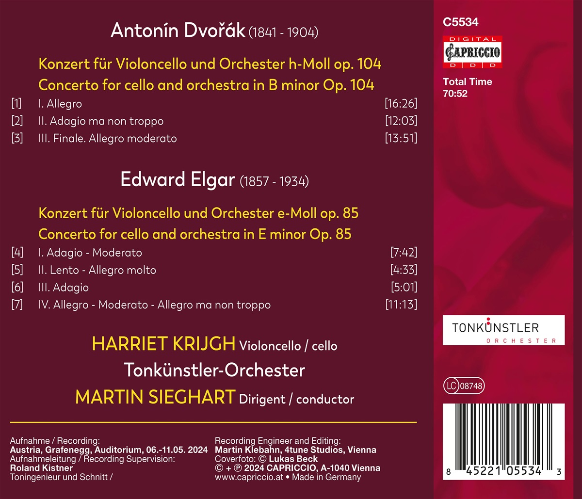 Harriet Krijgh ist eine der aufregendsten Cellistinnen der Gegenwart. Ihr kantables und ausdrucksstarkes Spiel berührt und begeistert Publikum wie Presse gleichermaßen. Ihre umfangreiche Diskographie umfasst Werke von Kabalevsky, Haydn, Brahms und Rachmaninov, wie auch ein Album mit Werken französischer Komponisten. Harriet Krijgh ist Preisträgerin zahlreicher erster Preise bei internationalen Wettbewerben. Sie war „Rising Star“ der European Concert Hall Organisation (ECHO) und übernahm 2017 und 2018 von Janine Jansen die künstlerische Leitung des Internationalen Kammermusikfestivals in Utrecht. Mit dem vorliegenden Album wagt sie sich erstmals in den Olymp der wohl berühmtesten Cellokonzerte: Mit der Aufnahme der Meisterwerke von Dvořák und Elgar geht für sie auch ein lang gehegter Wunsch in Erfüllung.