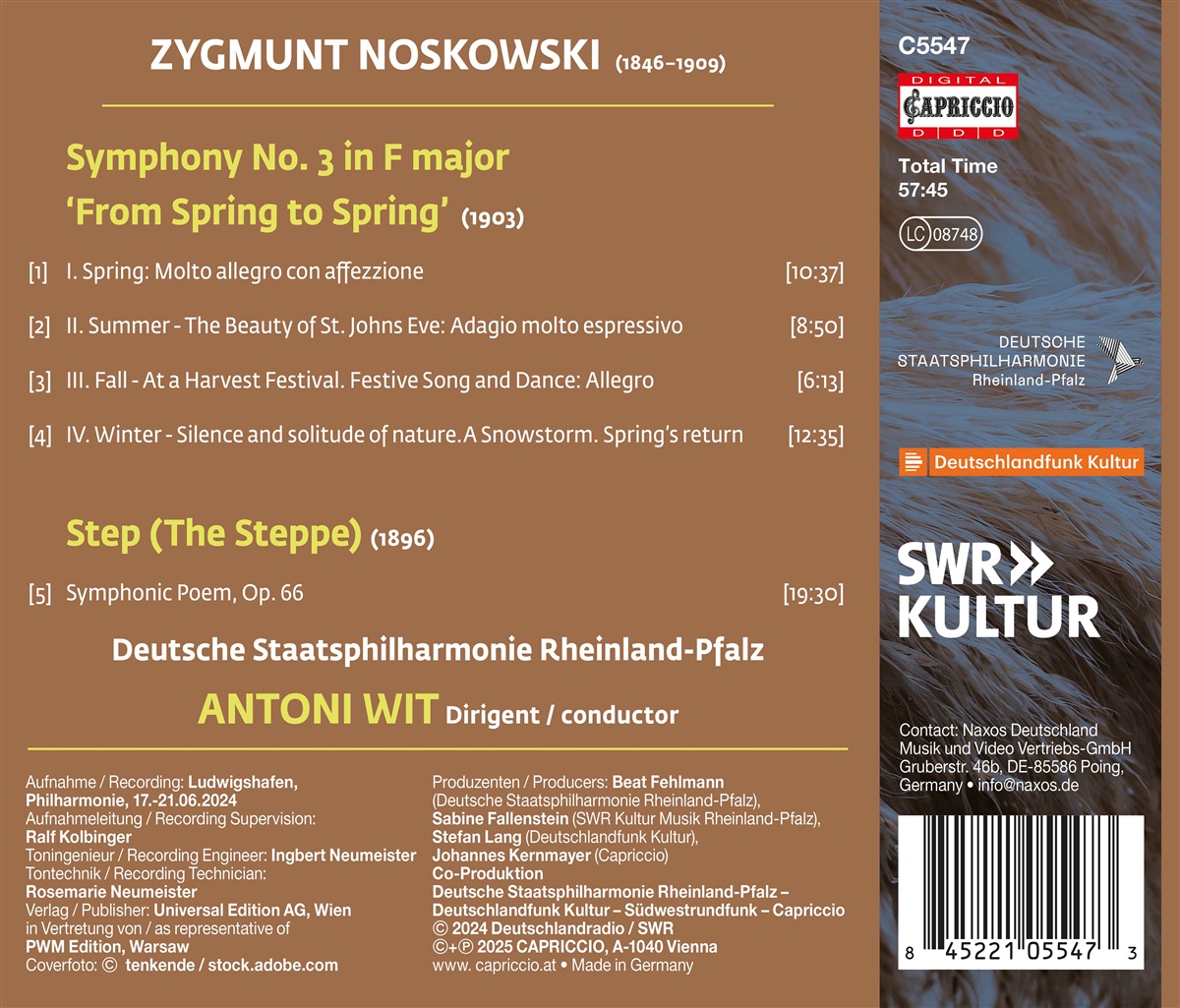Trotz seiner bekannten Schüler (u. a. Karol Szymanowski) und seines berühmten Lehrers (Stanisław Moniuszko) haben dennoch bisher nur wenige Musikliebhaber von Zygmunt Noskowski gehört. Und doch war er über weite Strecken des 19. Jahrhunderts der bedeutendste Vertreter moderner sinfonischer Musik in Polen. Seine Dritte Sinfonie wie auch die Tondichtung "Steppe", op. 66 verbinden tief empfundene Romantik mit polnischer Folklore. Mit seiner Sinfonie führt er uns auf eine virtuos musikalische Reise durch die Jahreszeiten, sowie auch die "Steppe" sich als beeindruckende Landschaftsmalerei erweist, mit Anklängen an Alexander Borodins Meisterwerk. Abermals kommen diese zu Unrecht vergessenen Werke durch das bewährte Dirigat des polnischen Dirigenten Antoni Wit ans Licht der Öffentlichkeit. Es spielt die Deutsche Staatsphilharmonie Rheinland-Pfalz und die Aufnahme entstand im Juni 2024 in der Philharmonie in Ludwigshafen.