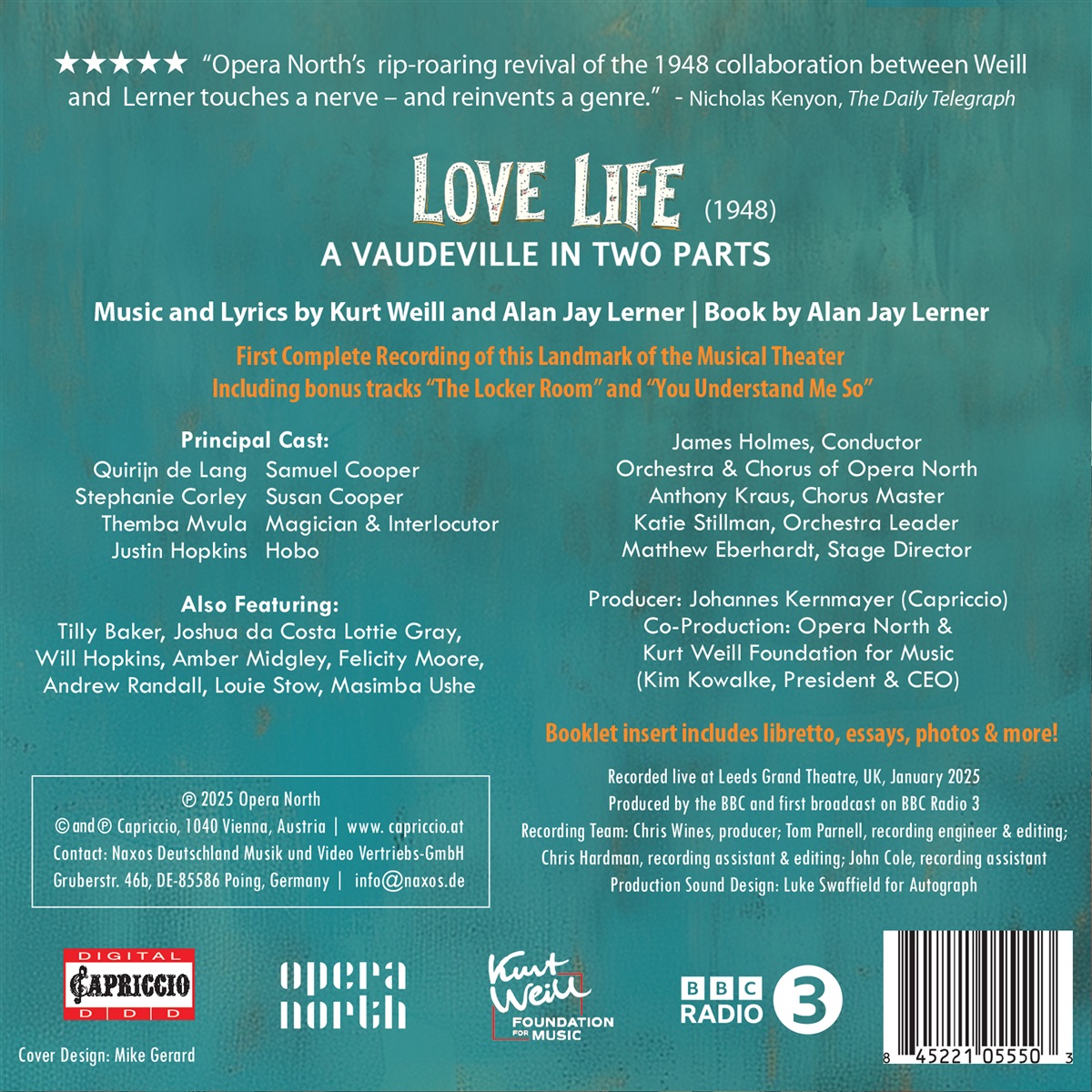 Als Konzeptmusical war „Love Life“ ein echter Wegbereiter, der Musicaltheater-Favoriten der 1960er, 70er und darüber hinaus inspirierte, von „Cabaret“ und „Chicago“ (ursprünglich mit dem Untertitel „A Musical Vaudeville“) bis zu Sondheims „Company“ (erzählt durch eine Reihe von Skizzen). Es ist ‚eine der besten Partituren von Weill‘ (Dirigent Jim Holmes), ein Meisterwerk der Verschmelzung verschiedener Musikstile, ‚ein Kompendium amerikanischer Musikidiome, die geschickt so ausgewählt wurden, dass sie zum dramatischen Stoff passen‘. Kurt Weill und Alan Jay Lerner schlossen sich 1947 zusammen, beide auf der Welle des Erfolgs („Street Scene“ für Weill, „Brigadoon“ für Lerner) und auf der Suche nach neuen Projekten. Als „Love Life“ 1948 am Broadway Premiere feierte, bezeichnete Weill es als ‚eine völlig neue Form des Theaters‘. Stephen Sondheim bezeichnete es als ‚einen nützlichen Einfluss auf mein eigenes Werk‘. Das Musical erzählt die Geschichte eines Ehepaares, das von 1791 bis 1948 immer das gleiche Alter hat und Eheprobleme durchlebt, die sich aus den unterschiedlichen sozialen Normen jedes Zeitalters ergeben.