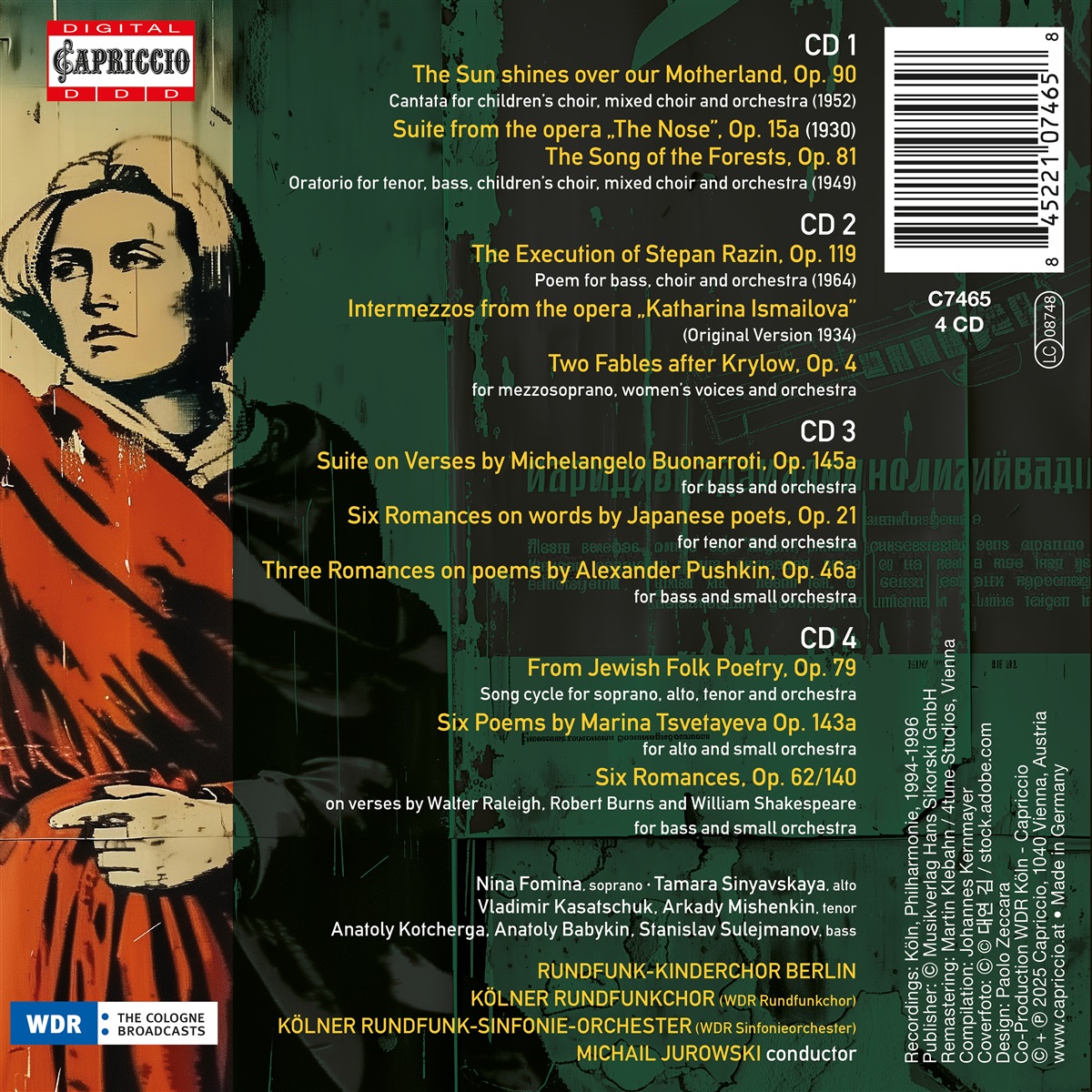 Dmitri Schostakowitsch ist bekannt für seine Sinfonien, seine Kammermusik, vielleicht noch die populären Suiten, eventuell noch einige wenige seiner Filmmusiken. Weitestgehend unbekannt sind jedoch seine vokalsymphonischen Werke, von denen lediglich der Zyklus „Aus jüdischer Volkspoesie“, op. 79, ein gewisses Maß an Popularität erlangt hat. In dieser Sammlung werden diese verborgenen Schätze in autoritativen Interpretationen unter Michail Jurowski und dem Kölner WDR Sinfonieorchester zusammengeführt, das eine reiche Schostakowitsch-Tradition (Rudolf Barshai, Semyon Bychkov et al.) aufzuweisen hat – von den „Sechs Romanzen auf Texte japanischer Dichter“, op. 21 bis zur „Suite nach Versen von Michelangelo Buonarroti“, opo. 145a. Echte Raritäten sind auch die „Sechs Gedichte von Marina Zwetajewa“, op. 143a und die eher berüchtige, denn berühmte Kantate für Kinderchor, gemischten Chor und Orchester „Über unserer Heimat strahlt die Sonne“, op 90.