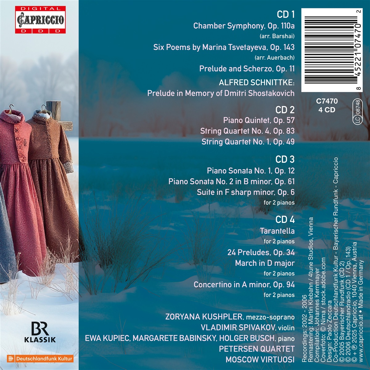 Dmitri Schostakowitsch ist fraglos einer der großen Komponisten des 20. Jahrhunderts und hinterließ Meisterwerke in jedem Genre – von den Sinfonien über Oper, Film- und Unterhaltungsmusik, Konzerten und natürlich Kammermusik. Diese Sammlung bietet einen hervorragenden Überblick über seine Beiträge zu diesem Genre, mit zahlreichen Highlights und einigen Raritäten. Die Zusammenstellung umfasst einige seiner Meisterwerke wie Rudolf Barschais Bearbeitung der „Kammersinfonie“ (eine kongeniale Transkription des Streichquartetts Nr. 8 für Kammerorchester), das Streichquartett Nr. 1 und das Klavierquintett, seine beiden Klaviersonaten und die selten gespielten „24 Präludien für Klavier solo“ (in lange vergriffenen Einspielungen von Margarete Babinsky) aber auch veritable Trouvaillen wie die selten gespielte Werke für zwei Klaviere, etwa die kurze, witzige „Tarantella“ oder das dramatische, filmische „Concertino“. Abgerundet wird die Sammlung durch Alfred Schnittkes Hommage an den Lehrer und Meister, das „Präludium in memoriam Dmitri Schostakowitsch“.