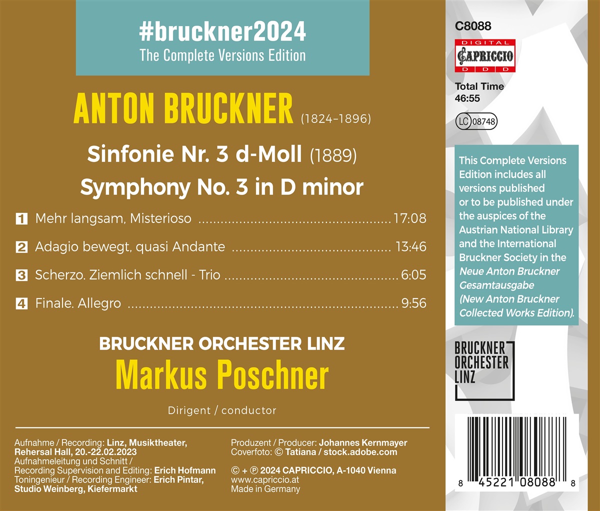 Bruckners dritte Sinfonie war eine schwierige Geburt und blieb auch noch lange über Bruckners Dasein hinaus ein Problemkind. Die erste Aufführung war eine veritables Fiasko für den Komponisten. Da half auch nicht der Enthusiasmus eines jungen Gustav Mahler, der sich gleich an einen Klavierauszug machte. Es ist das – ursprünglich – längste, das am meisten überarbeitetes Orchesterwerk. Sie gilt als die „wagnerischste“, und – gleichermaßen (und nicht ohne Widersprüchlichkeit) – die erste wahrhaft „brucknerische“ Sinfonie. Bruckner selbst fand hingegen die hier präsentierte dritte (!), straffere Bearbeitung „unvergleichlich besser“ als alle anderen Fassungen zuvor. Ob dem wirklich so ist, mag man nun selbst entscheiden.