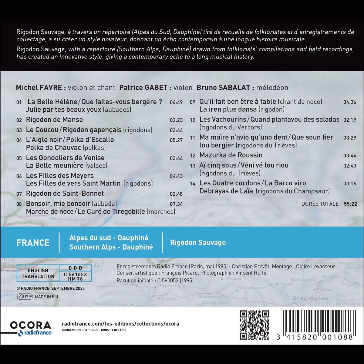 Das Ensemble Rigodon Sauvage hat mit seinem Repertoire einen innovativen Stil entwickelt, der einer langen Musikgeschichte ein zeitgenössisches Echo verleiht. Das Repertoire stammt aus den Regionen der Südalpen und der Dauphiné und speist sich sowohl aus folkloristischen Quellen als auch aus wissenschaftlichen Feldaufnahmen. In beiden Regionen wird u.a. der sogenannte „Rigodon“ oder „Rigaudon“, ein schwungvoller Tanz im Dreivierteltakt praktiziert. Je nach Landstrich hat er seine eigenen Besonderheiten. Melodisch-rhythmische Formen, Lernweisen, Funktionen, Beziehung zum Tanz usw. wurden auch unterschiedlich überliefert, auch wenn sich die Orte geografisch und manchmal auch kulturell nahestehen. Auf dem Album wird Tradition mit Moderne verknüpft und bleibt doch dicht an den überlieferten Tänzen.