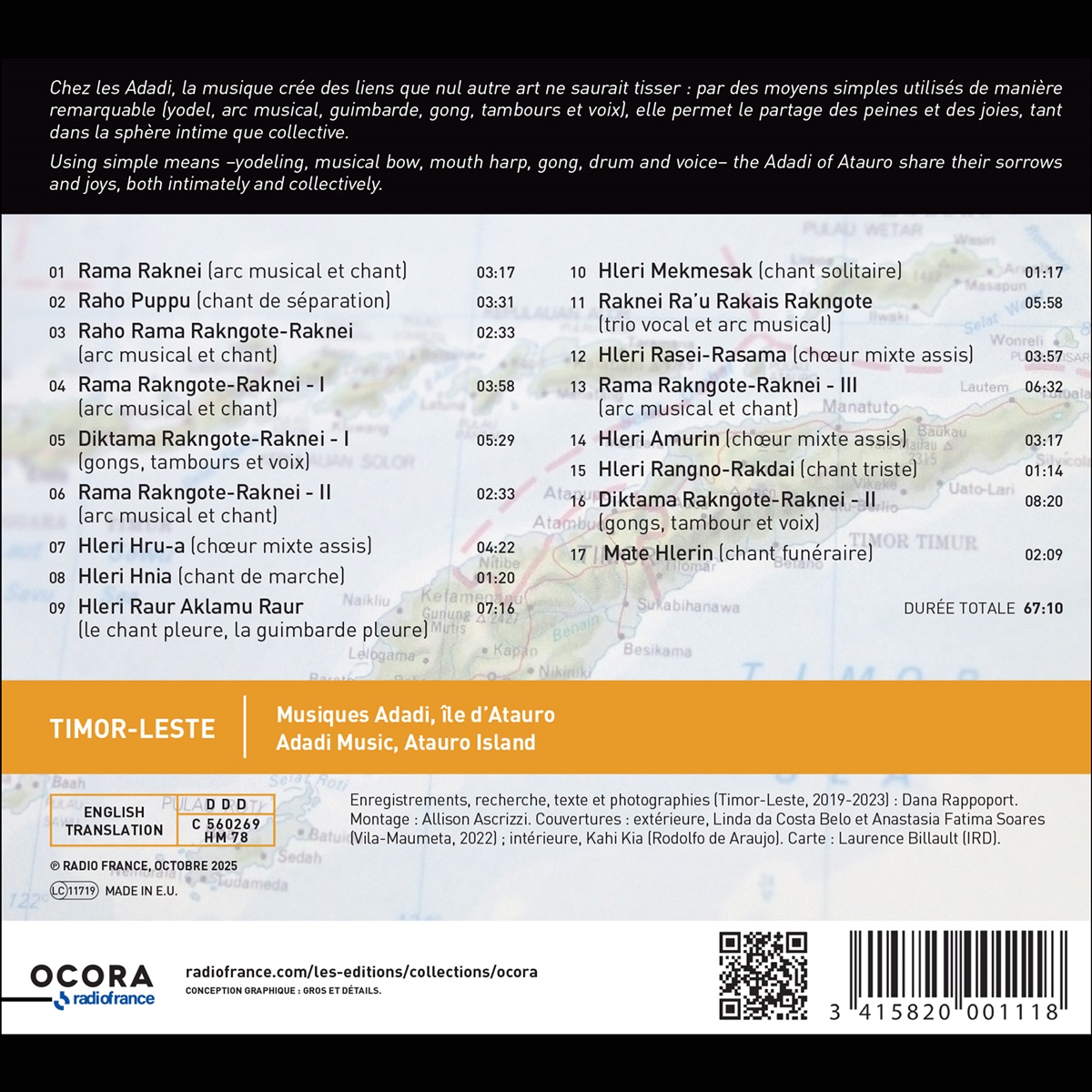 Mit einfachen Mitteln wie Jodeln, Maultrommel, Gong, Trommel und Stimme teilen die Adadi von Atauro ihre Sorgen und Freuden, sowohl im Intimen als auch gemeinschaftlich. Die Insel Atauro – nördlich vor Osttimor gelegen - zählt etwa 10.000 Einwohner, aufgeteilt in drei ethno-linguistische Gruppen, von denen nur die Adadi (rund 2.000 Menschen) eine vielfältige musikalische Praxis bewahrt haben – obwohl diese (ebenso wie ihre Sprache) vom Aussterben bedroht ist. Die Musik gibt den Takt für die Wege zu den Feldern vor und begleitet morgens und abends die Ernte des Palmweins. Sie kann zu Tränen rühren, mildert auch die Traurigkeit und verstärkt die Freude bei Feierlichkeiten, an denen alle Altersgruppen und Geschlechter teilnehmen. Trotz eines abrupten Abbruchs der Überlieferung im Jahr 1974 durch christliche Missionare sind einige Ritualgesänge noch in Erinnerung geblieben.
