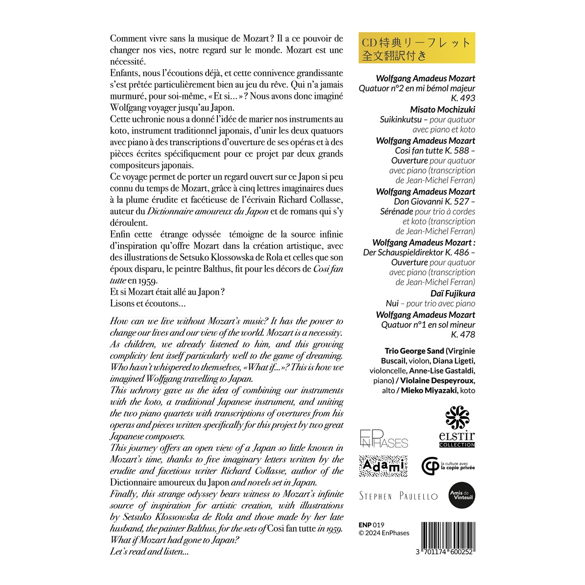 Wer hat nicht schon einmal zu sich selbst geflüstert: „Was wäre, wenn...“? So haben wir uns Wolfgang Amadeus Mozarts Reise nach Japan vorgestellt. Das brachte uns auf die Idee, unsere Instrumente mit der Koto, einem traditionellen japanischen Instrument, zu kombinieren und die beiden Klavierquartette mit Transkriptionen von Ouvertüren aus Mozarts Opern und eigens für dieses Projekt geschriebenen Stücken zweier großer japanischer Komponisten zu vereinen. Diese Reise bietet einen offenen Blick auf ein Japan, das zu Mozarts Zeiten so wenig bekannt war.