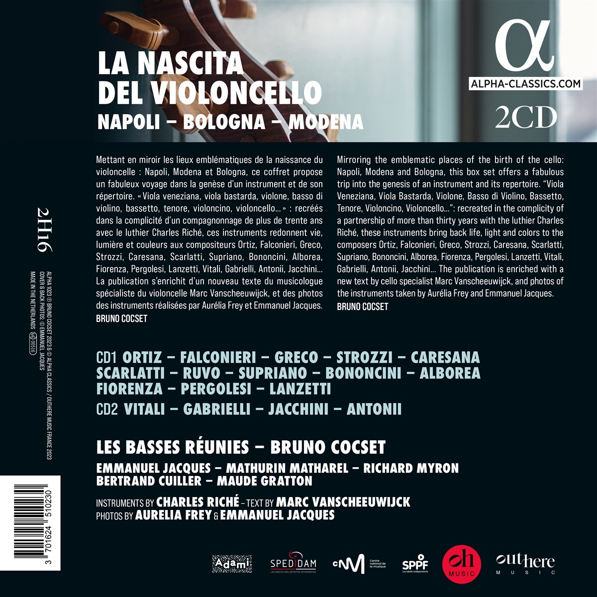 La Nascita del Violoncello: Die Geburt des Violoncellos. Bruno Cocset vervollständigt seine Entdeckungsreise mit dieser CD-Buch-Edition, die er 2011 startete. Die damals erste Aufnahme, die sich um Bologna und ihre Komponisten (Vitali, Gabrielli, Jacchini) dreht, wird in dieser Box wiederveröffentlicht und Cocset präsentiert mit den Musikern von Basses Réunies außerdem eine neue Aufnahme, die Neapel gewidmet ist. Dabei reicht das Spektrum vom Renaissance-Komponisten Diego Ortiz bis zu Lanzettis galantem und virtuosem Cellowerk und bietet zwei verschiedene Blickwinkel, um die Identität dieses Instruments besser zu begreifen. Die hier verwendeten Instrumente - Cocset spielt insgesamt zehn - zeugen sowohl von der Entwicklungsgeschichte des Instruments als auch von der Verbindung des Musikers mit seinem Geigenbauer Charles Riché.