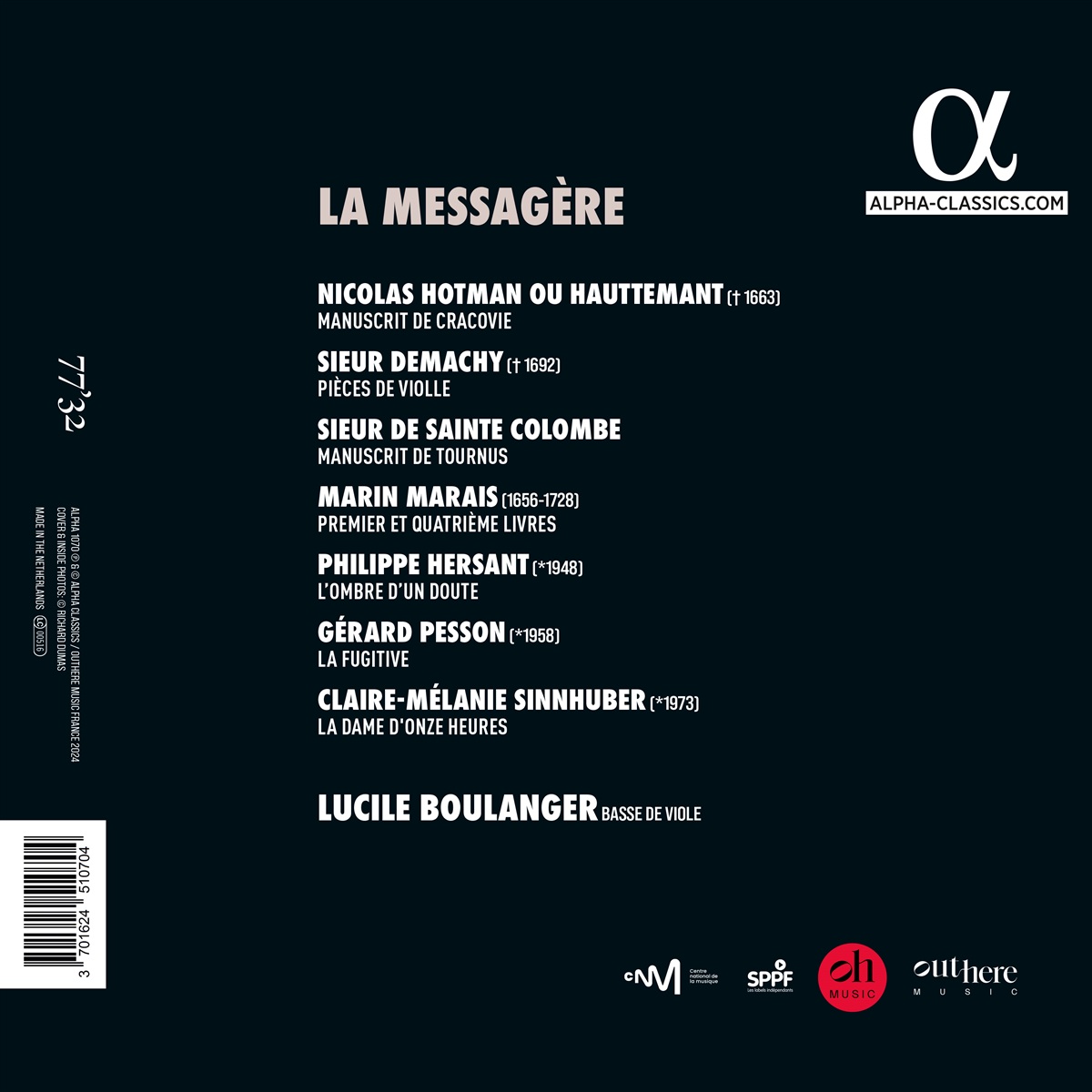 Nach dem großen Erfolg ihres Bach-Abel-Albums (ALPHA783) feiert Lucile Boulanger die französische Gambe im Laufe der Jahrhunderte vom 17. Jahrhundert (Marin Marais, Sainte-Colombe und Nicolas Hotman) bis zum einundzwanzigsten Jahrhundert. Mit zeitgenössischen Werken von Philippe Hersant, Claire-Mélanie Sinnhuber und Gérard Pesson, von denen einige speziell für Lucile Boulanger geschrieben wurden. „Es ist nicht mehr nötig zu beweisen, dass mein Instrument ein fester Bestandteil unserer Musiklandschaft ist. Die Gambe ist lebendig und gut. Seit mehreren Jahrzehnten inspiriert sie zu neuen Kompositionen, ihr Vokabular erweitert sich ständig“, so die Musikerin abschließend.
