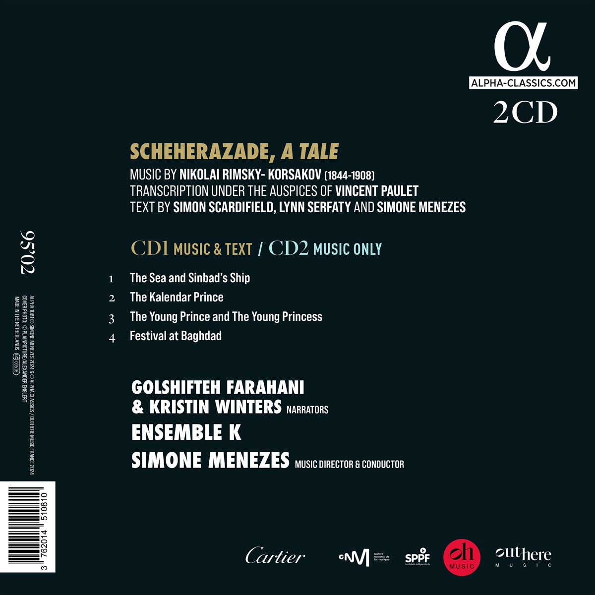 Dieses Album bietet eine neue Annäherung an die Figur der Scheherazade mit einem bisher unveröffentlichten Text, der frei aus Tausendundeiner Nacht und alten Liebesgedichten adaptiert wurde und die Geschichte von Scheherazade erzählt. Die musikalische Grundlage bildet Rimski-Korsakows musikalisches Meisterwerk, das für die Besetzung des Ensemble K transkribiert wurde. Die französisch-iranische Schauspielerin Golshifteh Farahani übernimmt die Rolle der Scheherazade, während Kristin Winters ihre Schwester Dinarzad darstellt. „Für mich ist diese Geschichte ein literarischer und historischer Schatz der Menschheit. Aber unsere kollektive Vorstellung hat Scheherazade entweder als Verführerin oder als unterwürfige Frau gesehen, die Geschichten erzählte, um zu überleben. Die Größe dieser Figur geht weit darüber hinaus und repräsentiert in der Tat die antike Figur des „Helden“ oder vielmehr der Heldin“, sagt Simone Menezes, die künstlerische Leiterin dieses Projekts. Auf dieser zweiten Zusammenarbeit mit Alpha Classics (nach Amazonia, ALPHA990) werden zwei Versionen des Programms präsentiert, eine mit Musik und Text, die andere ausschließlich mit der Musik von Rimski-Korsakow.