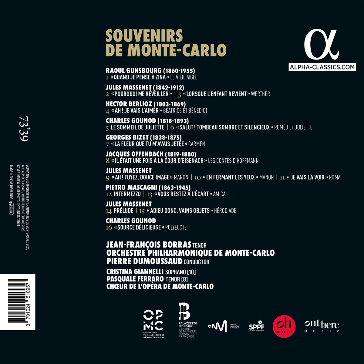 Dieses Rezital des Tenors Jean-François Borras ist eine Hommage an die faszinierende Geschichte der Opéra de Monte-Carlo, dem Haus, das mehr französisches Repertoire aufgeführt hat als jedes andere. Jean-François Borras, der seine erste Ausbildung im Chor der Kathedrale von Monte-Carlo erhielt und ein international anerkannter Botschafter des französischen Gesangsstils ist, präsentiert hier Auszüge aus Werken von Mascagni, Gunsbourg und Massenet, die für die dortige Opéra komponiert wurden. Raoul Gunsbourg war von 1893 bis 1951 Direktor der Opéra de Monte Carlo (Architekt Charles Garnier), und die Vielfalt seiner Programmgestaltung verhalf der Institution zu außergewöhnlichem Ruhm. Borras singt hier Arien aus Opern, die er auf der Bühne der Opéra de Monte-Carlo aufgeführt hat, darunter Roméo et Juliette (Gounod), Manon, Hérodiade, Werther (Massenet), Carmen (Bizet) und Les Contes d'Hoffmann (Offenbach), begleitet vom Orchestre Philharmonique de Monte Carlo unter Pierre Dumoussaud, einem jungen französischen Dirigenten und Spezialisten für das Opernrepertoire, der gerade eine internationale Karriere startet.