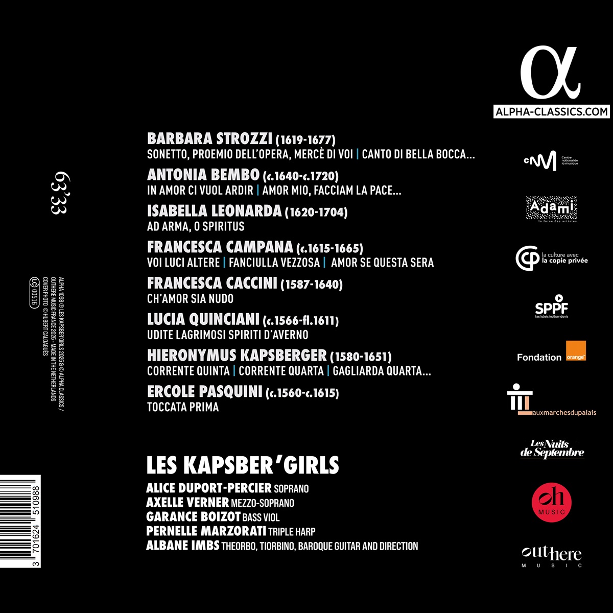 Les Kapsber'girls sind ein 2015 von der Lautenistin Albane Imbs gegründetes Vokal- und Instrumentalensemble. Der Name des Barockkomponisten Giovanni Girolamo Kapsberger ist gewissermaßen richtungsweisend, aber wird nicht dogmatisch in den Programmen verfolgt. Das Ensemble führte bereits erfolgreich Streifzüge durch sowohl italienisches wie auch französisches Repertoire durch und widmet sein drittes Album ausgewählten Barockkomponistinnen. Verborgene Talente, unentdeckte Schicksale - nur wenige dieser Komponistinnen hatten bisher die Gelegenheit, ihre Kunst zu offenbaren, die dennoch sehr real ist. Die jüngste Forschung hat es ermöglicht, die faszinierenden Werke von Barbara Strozzi (1619-1677), Isabella Leonarda (1620-1704), Lucia Quinciani (1566-1611), Francesca Caccini (1587-1641), Antonia Bembo (ca. 1643-1715 ) und Francesca Campana (ca. 1615-c.1665), die nicht weniger als zweihundert Werke komponierte, wiederzubeleben. Les Kapsber'girls machen diese Schätze hörbar.