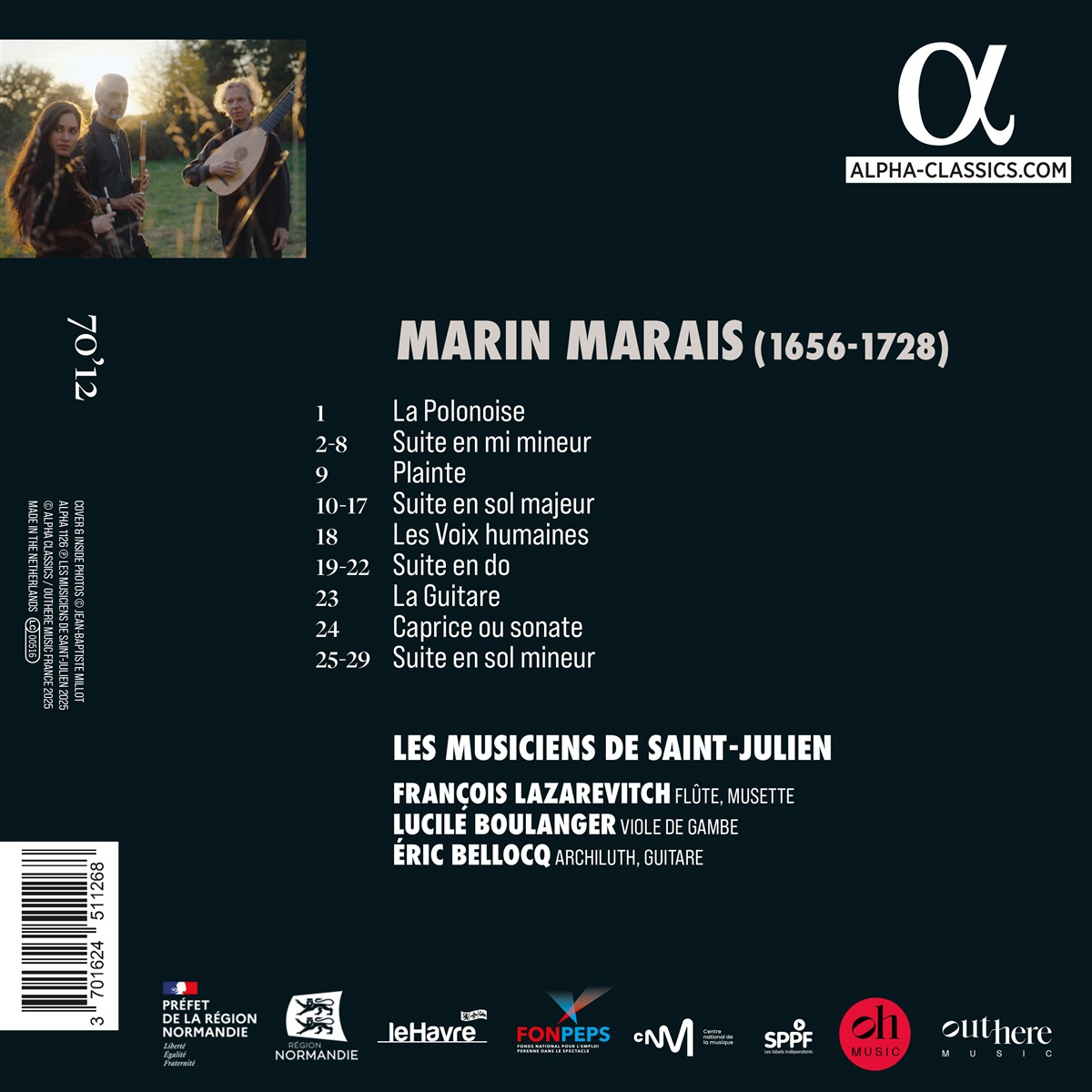 Marin Marais ist zwar vor allem wegen seiner Werke für Viola da Gamba bekannt, er komponierte aber auch für die Flöte. Erst kürzlich entdeckte Michael Lynn einige Manuskripte mit Stücken für Flöte und Basso continuo sowie Duette und erregte damit die Aufmerksamkeit von François Lazarevitch und Les Musiciens de Saint-Julien, die nun die ersten Aufnahmen dieser Werke präsentieren. „Dieses Neuland hat sich mir nicht sofort erschlossen, sondern erst nach einer mehr als ein Jahr dauernden Erkundung... Faszinierend ist, dass diese Stücke von Marais mit nichts vergleichbar sind, was im Flötenrepertoire bereits bekannt ist; die Flöte war zu dieser Zeit, um 1700, noch ein sehr junges Instrument“, so der großartige Flötist. Zur Begleitung hat François Lazarevitch seine langjährigen Partner Éric Bellocq (Laute) und Lucile Boulanger (Viola da Gamba) hinzugezogen, die auch "Les Voix humaines" spielt, eines der großen Meisterwerke, die für ihr Instrument geschrieben wurden.