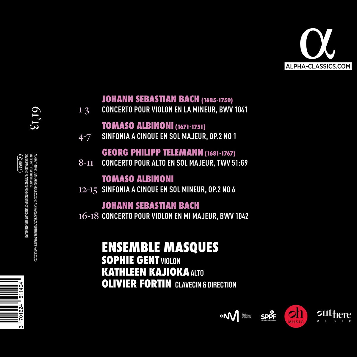 „Wir wollten schon lange die Violinkonzerte von Bach mit Sophie Gent aufnehmen, die seit 2003 zum Ensemble Masques gehört“, sagt Olivier Fortin, Cembalist und Gründer des Ensembles, das sich mit großer Leidenschaft der Barockmusik widmet. „Sophie ist eine außergewöhnliche Musikerin mit einem äußerst überzeugenden, ehrlichen und unprätentiösen Stil“. Eine weitere Stütze des Ensembles ist Kathleen Kaji, die Solistin von Telemanns Bratschenkonzert in diesem Programm. „Telemann ist ein fantastischer Geschichtenerzähler“, sagt sie, "er liefert eine Handlung, Charaktere, Kostüme und Requisiten - und überlässt es Ihnen, das alles zusammenzufügen". Die Sinfonien von Albinoni verbinden die Konzerte und stellen jeden Musiker des Ensembles ins Rampenlicht.