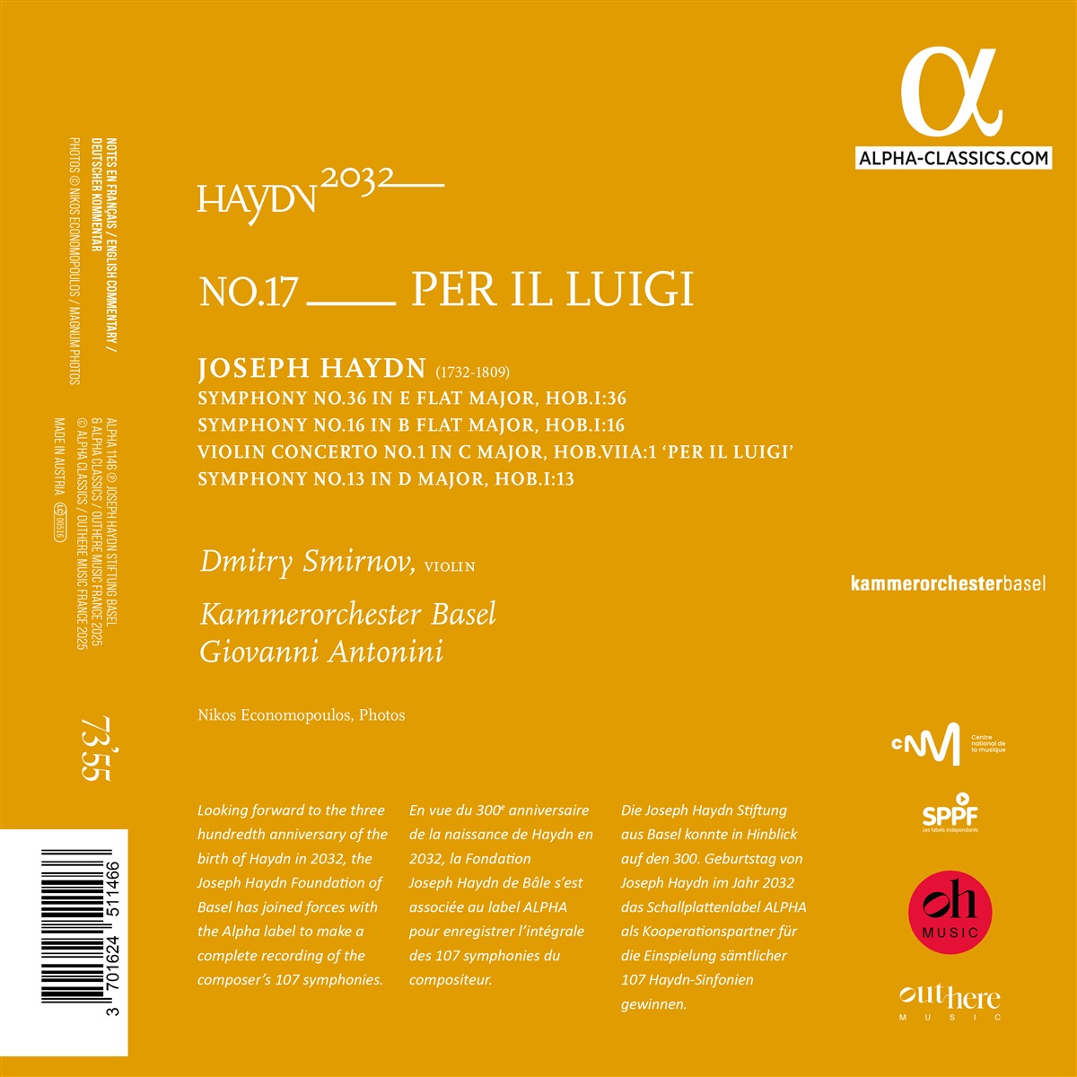 Mit Per il Luigi, der 17. Folge der Edition Haydn 2032, erklingen einige von Haydns frühesten Sinfonien, die das Talent derjenigen Musiker unter Beweis stellen sollten, die in derselben Zeit wie Haydn selbst in die Hofkapelle von Esterházy eingetreten waren. Im Mittelpunkt des Programms steht die Sinfonie Nr. 13 in D-Dur aus dem Jahr 1763, die mit vier Hörnern instrumentiert ist und in deren Schlusssatz das berühmte Thema der 25 Jahre später entstandenen „Jupiter“-Sinfonie von Mozart vorweggenommen wird. Das Violinkonzert in C-Dur ist in Haydns Werkverzeichnis als "fatto per il Luigi" bezeichnet und Luigi Tomasini (1741-1808) gewidmet, einem in Pesaro geborenen Geigenvirtuosen und Freund Haydns. Zwei Jahrhunderte später setzt sich der junge Barockgeigenvirtuose Dmitri Smirnov gemeinsam mit dem Kammerorchester Basel unter Giovanni Antonini mit Bravour für dieses Repertoire ein.