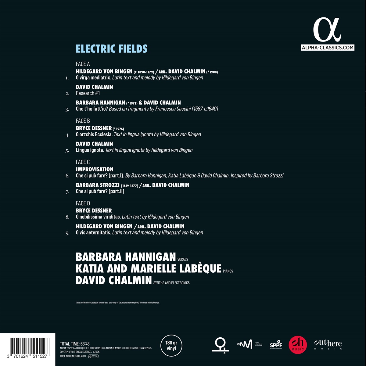 Dies ist die Vinyl-Ausgabe eines ganz besonderen Albums mit Barbara Hannigan und Katia und Marielle Labèque. Bearbeitung von jahrhundertealter Vokalmusik in modernen Arrangements sowie neue Kompositionen für Sopran, Klavier und Live-Elektronik sind auf dem Album "Electric Fields" zu hören. Die meditativen Kompositionen der mittelalterlichen Universalgelehrten Hildegard von Bingen sind der Ausgangspunkt für dieses Album. Hildegards Texte erheben sich sowohl in lateinischer Sprache als auch in der von ihr erfundenen Lingua ignota in die spirituelle Sphäre. Auch die volkstümlichen Liebeslieder zweier Komponistinnen des italienischen Barocks, Barbara Strozzi und Francesca Caccini, dienten als Inspiration für dieses Album. Mehrere Werke des amerikanischen Komponisten Bryce Dessner runden das eklektische Programm ab. Die Sopranistin Barbara Hannigan und die Pianistinnen Katia und Marielle Labèque werden vom Komponisten und Interpreten David Chalmin auf dieser fesselnden Reise durch meditative und stimmungsvolle musikalische Atmosphären begleitet. Gemeinsam erschaffen sie einen intensiven und einzigartigen Klangkosmos.