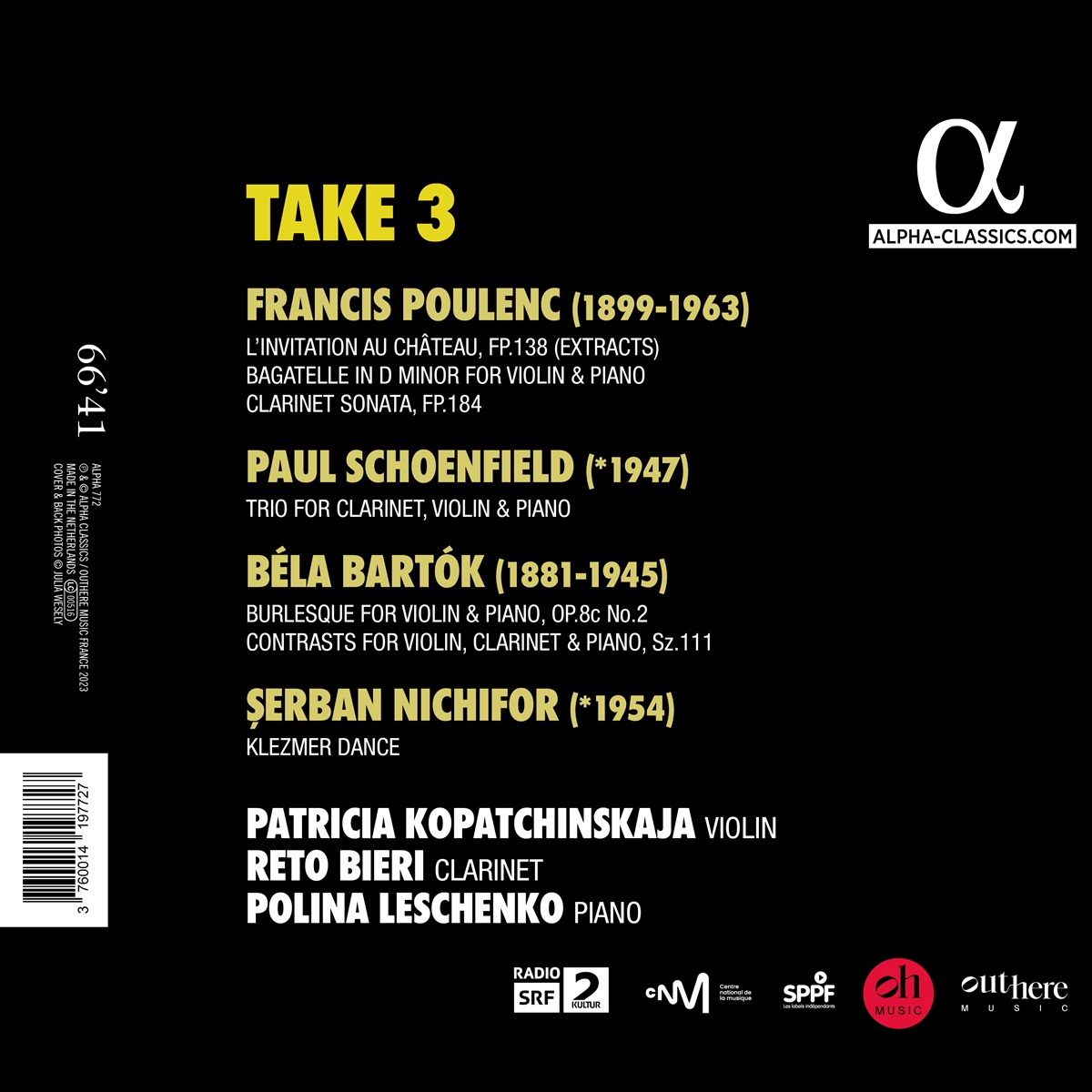 Die Grundidee dieses Albums war, zu dritt zu spielen... Nicht um „etwas" zu spielen, sondern um „zu dritt" mit so unterschiedlichen Klangwelten wie denen von Bartók, Poulenc und Schoenfield zu experimentieren. Fast zehn Jahre nach Take 2 (Alpha211) trifft sich Patricia Kopatchinskaja wieder mit zwei großartigen Mitstreitern, dem Klarinettisten Reto Bieri und der Pianistin Polina Leschenko, für ein Programm, das auf Trios basiert und die Wurzeln dieser drei Musiker feiert.