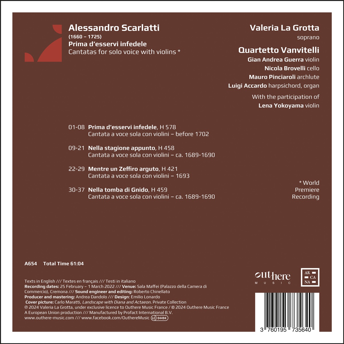 Das gesamte Kantatenwerk von Alessandro Scarlatti umfasst mehr als 800 Titel, nur ein Bruchteil davon wurde für zwei Violinen, Solo-Stimme und continuo komponiert. Aus diesen wählte das Quartetto Vanvitelli in seiner fünften Einspielung für Arcana vier unveröffentlichte Kantaten: Werke, die mit dem gewaltigen römischen Mäzenatentum des letzten Jahrzehnts des 17. Jahrhunderts und insbesondere mit „La Giorgina“ (wie Angela Voglia genannt wurde) in Verbindung gebracht werden. Sie war damals die berühmte Sopranistin, die zunächst mit Christina von Schweden und dann mit dem spanischen Herzog von Medinaceli verbunden war, dessen Geliebte sie sowohl in Rom als auch am vizeköniglichen Hof von Neapel war. Die mit der Aufgabe betraute Sängerin, Giorginas Stimme und Anziehungskraft wiederzubeleben, ist in dieser Aufnahme Valeria La Grotta, eine Barockspezialistin und hervorragende Interpretin eines Repertoires, mit dem sie sich auch als Wissenschaftlerin auseinandergesetzt hat.