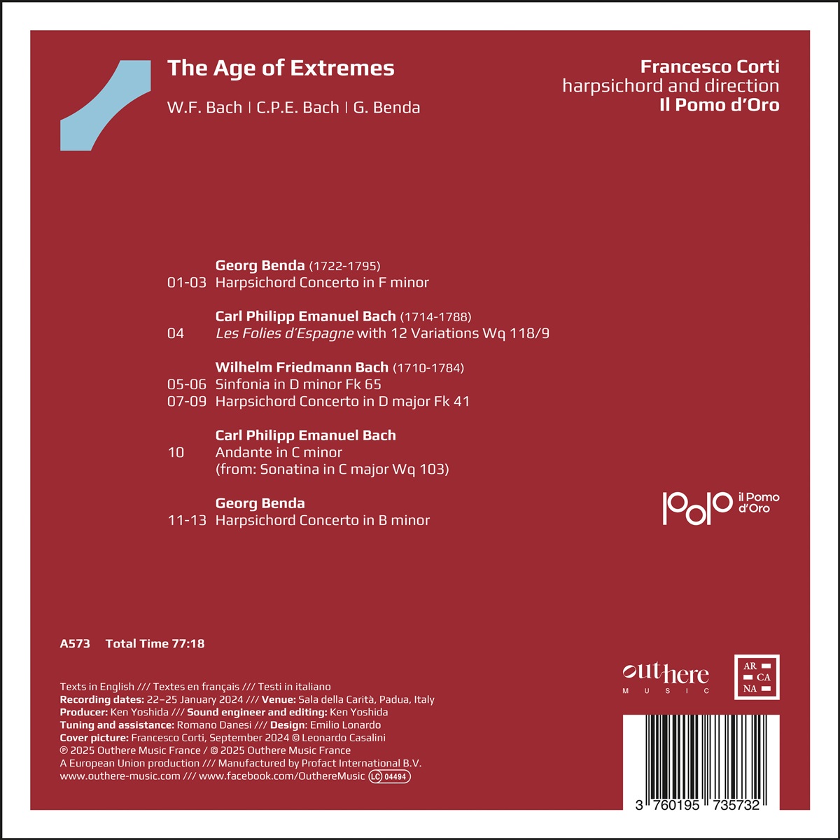 Diese Aufnahme vereint drei bedeutende Vertreter der Generation des empfindsamen Stils. Als Reaktion auf den Spätbarock von J.S. Bach und G.F. Händel setzen sie in ihren Kompositionen systematisch auf Kontraste und extreme Gegenüberstellung. Dieser avantgardistische Stil blieb nur für kurze Zeit in Mode, nahm aber viele bedeutende Aspekte der Frühromantik bereits vorweg. Das Album kombiniert ein Cembalokonzert von Wilhelm Friedemann Bach (dem ältesten Sohn von J.S. Bach) mit zwei Konzerten des böhmischen Komponisten Georg Benda. Diese illustrieren perfekt den empfindsamen Stil, der rasch zwischen Erregung und Melancholie, furioser Raserei und heiterer Gelassenheit wechseln kann. Das Programm schließt mit großen Solocembalostücken von Carl Philipp Emanuel Bach sowie einem Adagio und einer Fuge für Orchester von Wilhelm Friedemann Bach, die das Können der Komponisten im stile antico unter Beweis stellen.