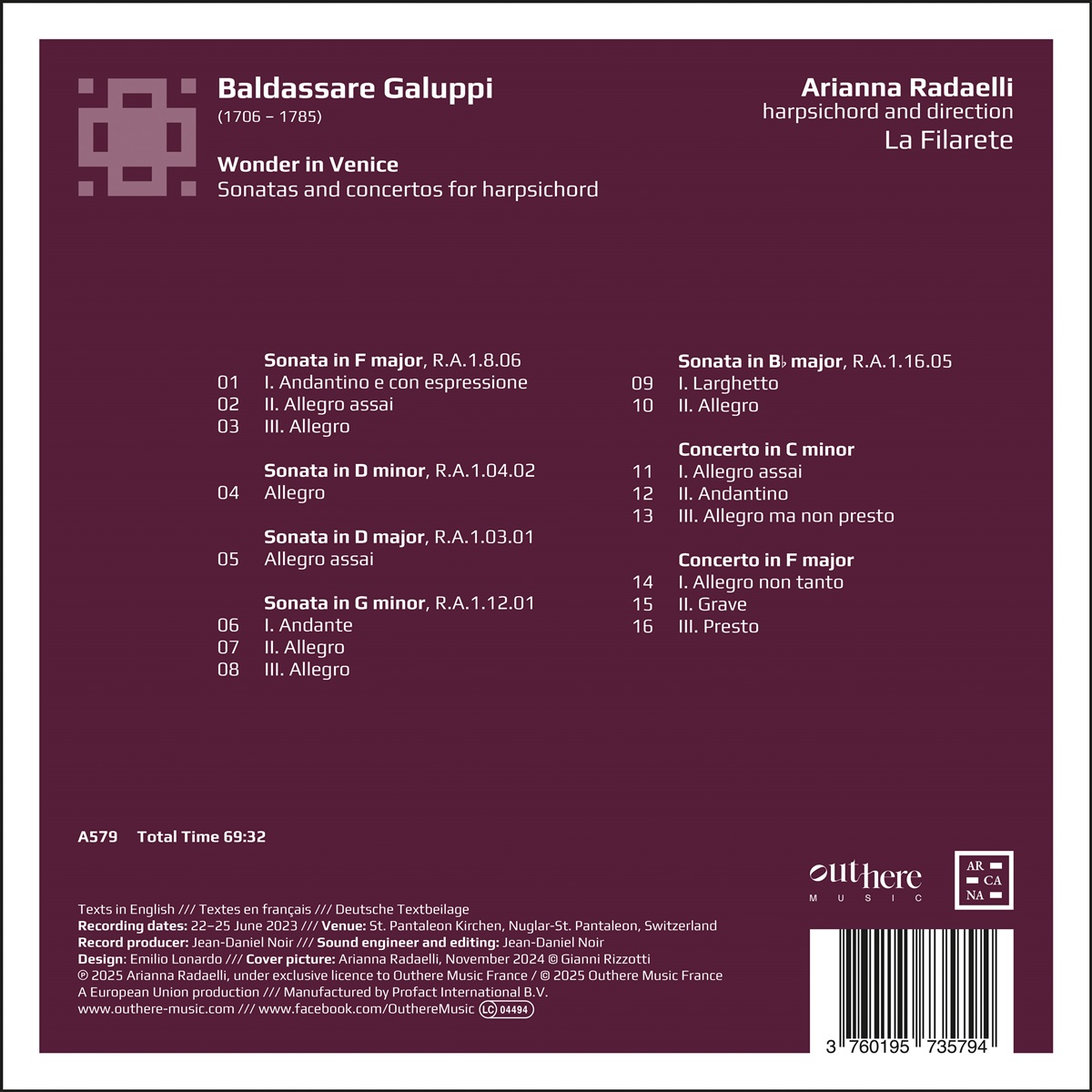 Die Aufgabe, die der Barock dem galanten Stil hinterließ, war es, das Publikum in Staunen zu versetzen. Der gefeierte Opernkomponist und Tastenvirtuose Baldassare Galuppi erreichte dies, indem er die Mittel der bildenden Kunst auf die Musik anwandte und mit Licht, Farbe und Perspektive spielte. Das innovative Feuer seiner Fantasie und die Anmut seiner Cantabiles fingen den Geist der Stadt Venedig mit der Launenhaftigkeit und Dramatik des neuen Goldonischen Theaters ein und machten ihn in ganz Europa berühmt. Mit einer Auswahl von Solosonaten und Konzerten für Cembalo und Streicher illustriert „Wonder in Venice" den Eklektizismus von Galuppis Musik, die den Glanz des venezianischen galanten Stils mit stürmischen Ausbrüchen des Sturm und Drang verbindet. Die junge italienische Cembalistin Arianna Radaelli, die auch mit Il Pomo d'Oro, Zefiro und Jordi Savall auftritt, gibt Galuppis Werken eine neue Lesart, die der historischen Aufführungspraxis treu bleibt, aber auch dynamisch und kühn ist. Flankiert von dem hervorragenden Streicherensemble La Filarete erkundet sie erfolgreich die Ausdruckskraft dieses Repertoires, das reif für eine Wiederentdeckung ist.