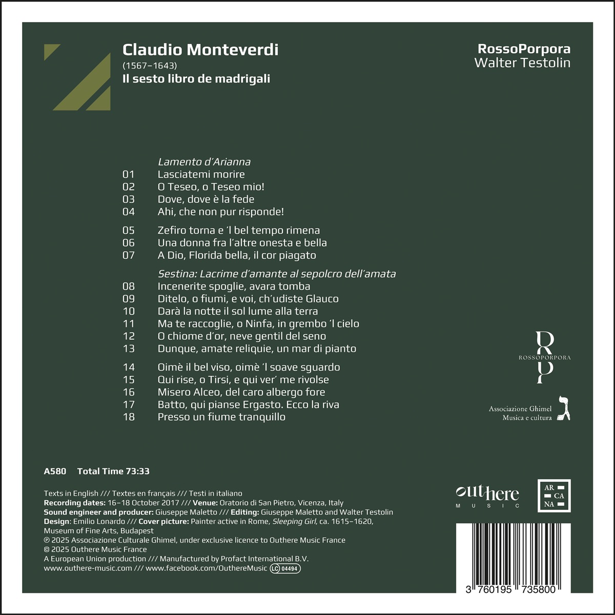 Das Ensemble RossoPorpora debütierte bei Arcana mit einem Luca Marenzio gewidmeten Album, das u. a. mit dem Preis der Deutschen Schallplattenkritik und einer Fünf-Sterne-Diapason-Bewertung ausgezeichnet wurde. Forum Opéra pries es als „Platte für die einsame Insel“. Mit seinem zweiten Album wendet sich das Ensemble einem der Eckpfeiler der Musik des 17. Jahrhunderts zu: Claudio Monteverdis Sechstem Madrigal-Buch. RossoPorpora taucht tief in die innere Welt des Komponisten während dessen letzten Jahre in Mantua ein und liefert eine zutiefst bewegende Interpretation der zahlreichen Meisterwerke der Sammlung: "Lamento d'Arianna", "Lagrime d'Amante sul sepolcro dell'Amata", "Zefiro torna", "Oimè 'l bel viso", "Qui rise o Tirsi". Eine Sammlung der größten Erfolge in der Geschichte des Madrigals.