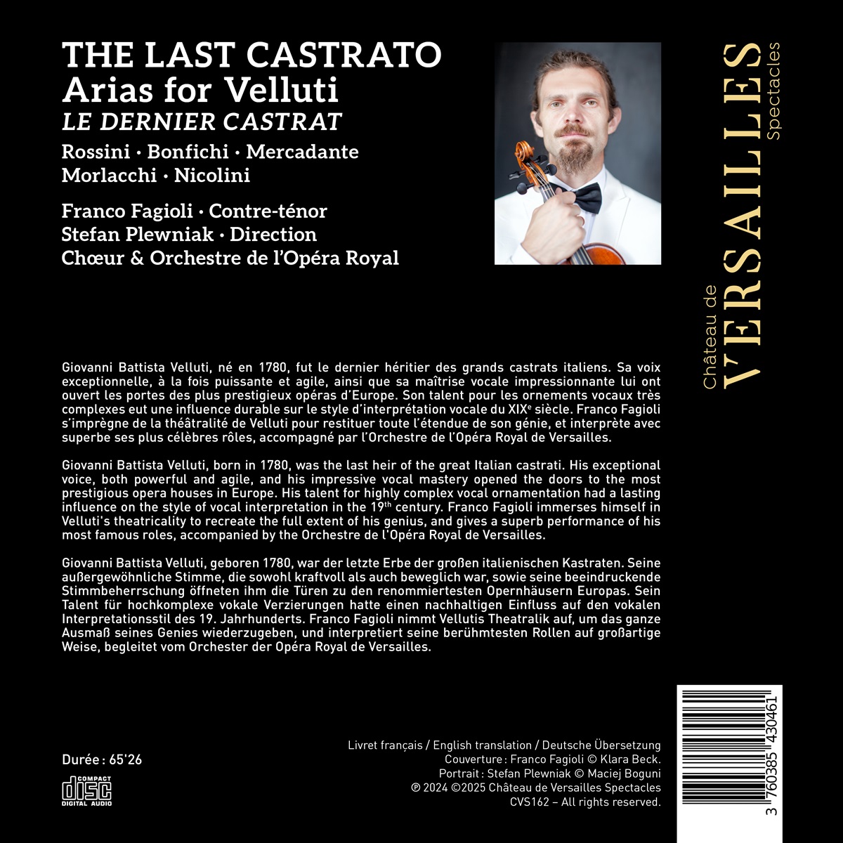 Giovanni Battista Velluti, geboren 1780, war der letzte Vertreter der großen italienischen Kastraten. Seine außergewöhnliche Stimme, die sowohl kraftvoll als auch beweglich war, und seine beeindruckende Gesangskunst öffneten ihm die Türen zu den renommiertesten europäischen Opernhäusern. Sein Talent für hochkomplexe Gesangsornamente hat den Stil der Gesangsinterpretation im 19. Jahrhundert nachhaltig beeinflusst. In Begleitung des Orchestre de l'Opéra Royal de Versailles taucht Franco Fagioli in Vellutis Welt ein und vermittelt das Ausmaß von dessen Genie anhand seiner berühmtesten Rollen.