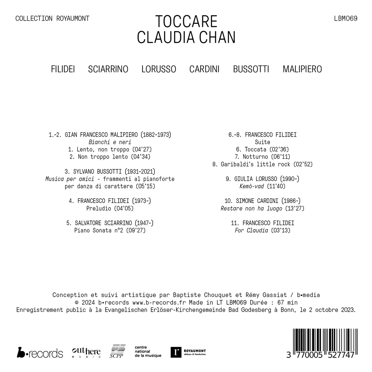 Nach ihrem ersten b-records-Album, dem Ergebnis ihres Aufenthalts bei der Fondation Royaumont, präsentiert Claudia Chan, Botschafterin des zeitgenössischen pianistischen Repertoires, ihr neues Album, das der italienischen Schule gewidmet ist. Von den Meistern Salvatore Sciarrino und Sylvano Bussotti bis zur neuen Generation um Francesco Filidei, Simone Cardini und Giulia Lorusso offenbart die Künstlerin den Reichtum eines nationalen Erbes, das von einem freien Geist und der Sinnlichkeit der Klänge geprägt ist, die unter ihren Fingern widerhallen, manchmal sogar bevor sie die Tasten betätigen... Ein Programm mit hohem Entdeckungspotenzial!