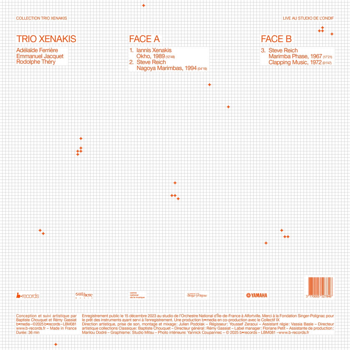 Mit dieser Vinyl-Edition konzentriert sich das Xenakis Trio auf zwei wichtige Säulen seines Repertoires: Iannis Xenakis und Steve Reich. Zwei unterschiedliche Visionen des zeitgenössischen Schlagzeugs werden in einem Dialog aus Materialien, Rhythmen und Resonanzen zusammengeführt.