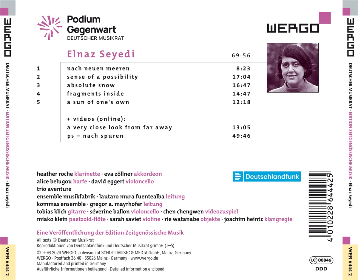 Die Musik des iranischen Komponisten Elnaz Seyedi fordert den Hörer heraus, vielschichtige und subtile Klänge zu entdecken, oft an der Grenze der Wahrnehmung. Seyedis Kompositionen zeichnen sich durch das gleichzeitige Vorhandensein von Gegensätzen wie den weit auseinander liegenden Registern der Instrumente und der Spannung zwischen Fragment und Kontinuum, Entwicklung und Stillstand, tonaler Abstraktion und rätselhaften Beziehungen zu außermusikalischen Inhalten aus. Besonders auffällig sind die Anleihen an die Poesie, die oft den intellektuellen Nährboden ihrer Werke bilden, wie zum Beispiel in „Nach neuen Meeren“ für Klarinette und Akkordeon, das für das Duo Zöllner-Roche geschrieben und von diesen interpretiert wird. Es basiert auf dem gleichnamigen Gedicht von Friedrich Nietzsche. Das Gemälde „Die Sonne“ von Edvard Munch wiederum inspirierte Seyedi zu dem Ensemblewerk „A sun of one's own“. Feinste Farbabstufungen und eine nicht wahrnehmbare Aufhellung werden hier vom Kommas Ensemble wiedergegeben. Neben traditionellen Instrumenten experimentiert die Komponistin in Zusammenarbeit mit dem Komponisten Ehsan Khatibi in dem musikalisch-szenischen Werk „PS-nach Spuren“, das als Online-Video in dieses Porträt integriert ist, auch mit ungewöhnlichen Klangerzeugern wie Spachtel in verschiedenen Größen und Tonhöhen. In der Interpretation von „fragments inside“ durch das Ensemble Musikfabrik sind spezielle Instrumente des Mikrotonalitäts-Pioniers Harry Partch zu hören.