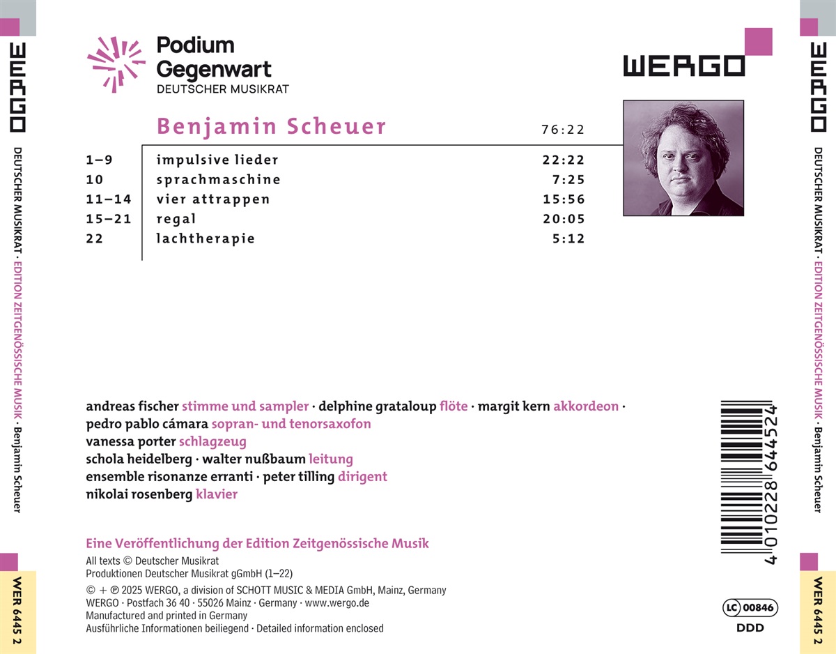 Neben drei Ensemblewerken komplettieren zwei Solostücke, interpretiert von Vanessa Porter und Nikolai Rosenberg, sowohl als Audio als auch als Video das Porträt. Hier wird deutlich, dass sich Scheuer einer breiten Palette an Klängen bedient: Gummischwein, Kazoo oder Ausfahrtröte ertönen ebenso wie traditionelle Klangerzeuger. Und nicht zuletzt steht der Mensch mit seiner Stimme im Zentrum des kompositorischen Interesses, wie in „Lachtherapie“, in dem der Pianist mit irrwitzigen Lach-Nuancen verblüfft.
