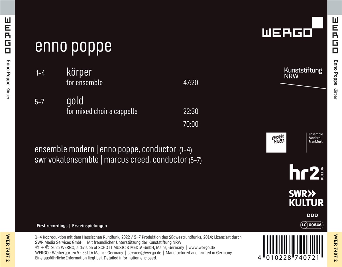 Enno Poppe hat für zwei der bedeutendsten Ensembles der zeitgenössischen Musik „maßgeschneiderte“ konzise Ensemblewerke geschaffen: „Gold“ – ein reines Vokalwerk für das SWR Vokalensemble – und „Körper“ – für das Ensemble Modern. In dem dreiteiligen A-cappella-Werk „Gold“ (eines seiner beiden bisherigen Chorwerke) gibt sich Poppe erstmals seiner Vorliebe für die lustvoll-exzessiven Texte von Arno Holz (1863–1929) hin, einem der wichtigsten Vertreter des deutschen Naturalismus und der literarischen Moderne. Die Gedichte stehen in parodistischer Beziehung zu weniger humoristischer Hochliteratur. Der geschmeidige Zauberklang des SWR Vokalensembles zeigt sich souverän in verschiedenen Kombinationen, manchmal wie in alter Vokalpolyphonie auf 24 Stimmen aufgefächert. „Körper“ führt uns an ein anderes Ende der Skala möglicher Klänge. Hier bilden die 21 Solisten des Ensemble Modern eine beeindruckende Big Band, ergänzt durch passende Holz- und Blechblasinstrumente (natürlich auch Saxophone). Hier geht es Poppe jedoch mehr darum, das, was die Big Band als „Klangkörper“ bietet, d. h. die Klangfarben, dynamische und rhythmische Möglichkeiten, mit den Mitteln der Neuen Musik, einer Kunst, die das Ensemble Modern wahrhaft perfektioniert hat, zu erforschen und zu erweitern. Wie so oft bei Poppe durchläuft das Stück „Körper“ mehrere Prozesse der Intensivierung und des Zusammenbruchs. In den Höhepunkten ist die Körperlichkeit der Musik fast überwältigend. Den Kern des Stücks bilden jedoch die intimen, dünn besetzten Momente, in denen sich die elektrischen Streicher ganz allmählich mit dem Schlagzeug erheben oder ein Saxophon, ein Keyboard oder eine Posaune aus dem Klangdickicht heraustreten und sich ein paar Momente der Selbstfindung gönnen.