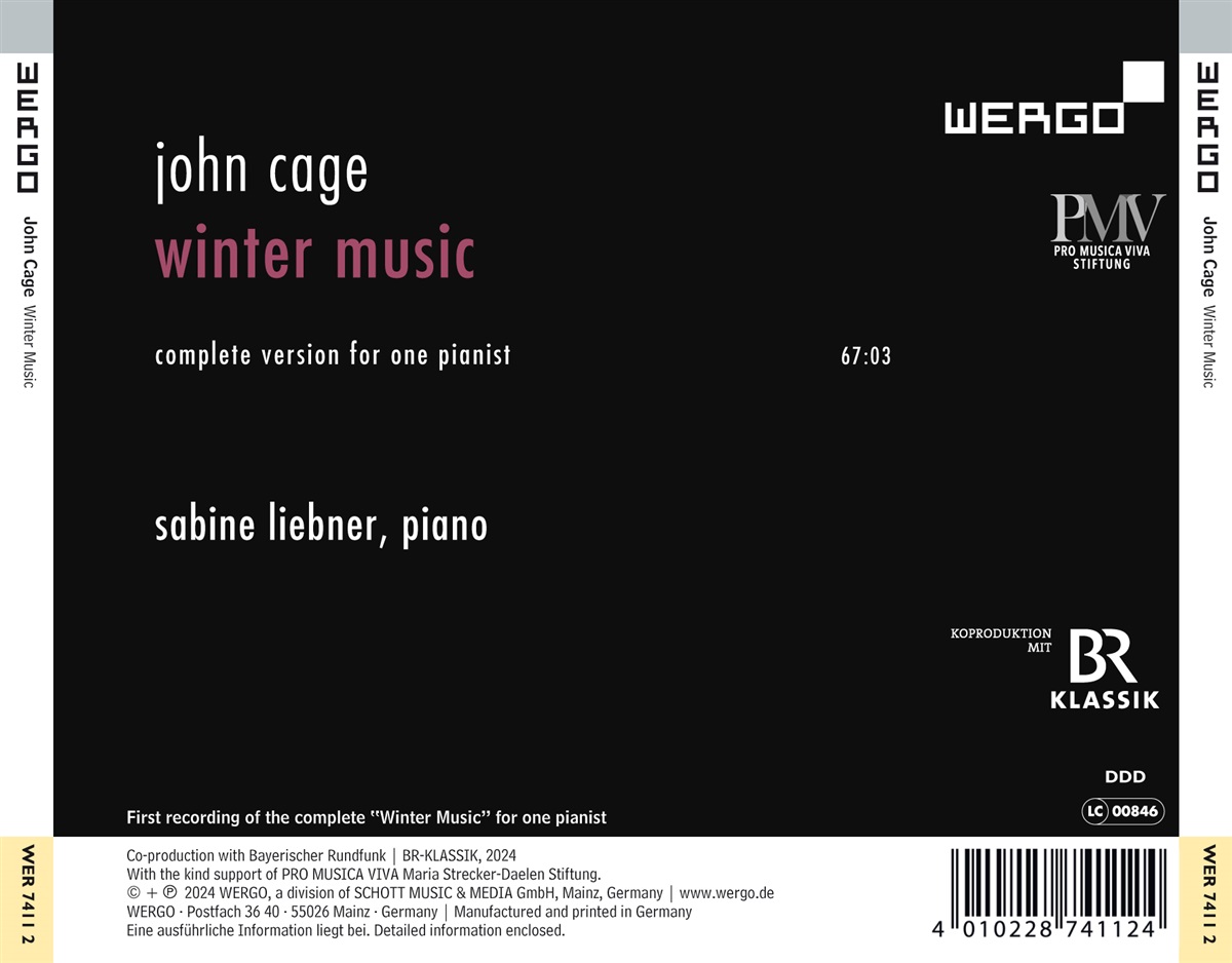 John Cages Bedeutung für eine umfassende ästhetische Neuorientierung der Neuen Musik nach dem 2. Weltkrieg kann kaum hoch genug eingeschätzt werden. Dabei fand die Selbstfindung und kompositorische Artikulation besonders auf dem Gebiet der Klaviermusik statt: im Künste-verschmelzenden Experimentallabor New York um den Tänzer Cunningham, den Maler Rauschenberg und den kongenialen Interpreten und Pianisten Tudor. Es ist ein Glücksfall, dass sich Sabine Liebner, die bei Wergo bereits mehrere international hochgelobte Alben veröffentlicht hat, in die immensen pianistischen und künstlerischen Aufgaben der Darstellung eines weiteren Cage’schen Großwerks gestürzt hat. Entstanden ist die Ersteinspielung der vollständigen „Winter Music“ für eine(n) Pianist:in: Von jeder der insgesamt 20 unnummerierten Seiten werden alle notierten Ereignisse (Aggregate) konsekutiv gespielt. Die unspielbaren Noten dieser Aggregate sollen jeweils als „harmonics“ durch stummes Niederdrücken der Tasten als Obertonschwingungen realisiert werden. Durch diese große, entscheidende Bereicherung des Klangraums entsteht eine sehr differenziert klingende, kaleidoskopartige Musik von überraschend eigenwilliger Schönheit. „Winter Music“ fordert eine neue Art zu hören ein: das Hören des Klangs in kristalliner Klarheit und permanenter Veränderung im Inneren und Äußeren des Klangs. Diese Einspielung stellt einen Meilenstein und Bezugspunkt für die weitere Wirkung der „Winter Music“ dar.