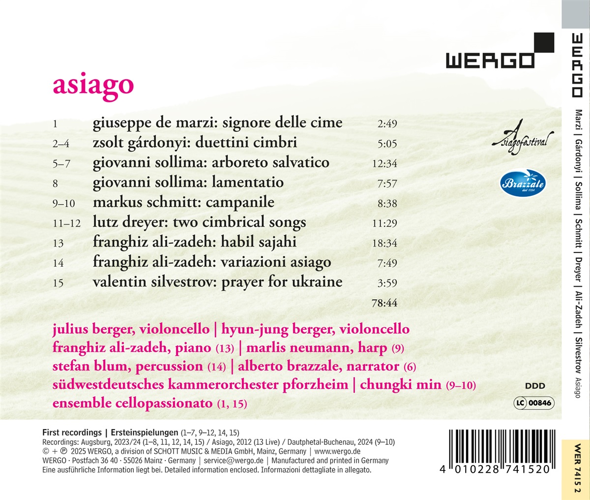 Das neue Album „Asiago“ des kreativen Cello-Solisten Julius Berger ist eine kluge Anwendung und Fortentwicklung einer sehr erfreulichen, starken neuen Tendenz im Musikleben: fantasievolle Erschließungen neuer Repertoire-Felder durch Öffnung neuer Musik zu den riesigen Bereichen anderer Kulturen. Diese Entwicklung scheint im Fall des Violoncello geradezu provoziert durch dessen technische und traditionelle Repertoire-Grenzen. Julius Berger führt vor, wie man sogar in einer Landschaft wie den Alpen, die als Stammland bekannter traditioneller Volksmusikgeschichte mit der klassischen Musik eng verwoben zu sein scheint, bei genauem Hinschauen höchst spannende ganz andere Ethno-Potenziale entdecken kann. Aus dem kostbaren Fund der kleinen Volksgruppe der Cimbern, die sich aus dem Norden kommend vor Jahrhunderten im heutigen Oberitalien niedergelassen haben und dort bis heute mit eigener Sprache leben, entwickelt er ein abgerundetes CD- Programm neu geschriebener Musik. Diese ist größtenteils in dem seit 25 Jahren existierenden Asiago-Festival erstmals erklungen, und gewinnt in verschiedenen Kombinationen – solo, im Duett, mit präpariertem Klavier und mit Cello-Ensemble und Kammerorchester dem tiefen Streichinstrument und auch menschlicher Stimme ein großes, suggestiv-meditatives neues Repertoire ab. Bei einigen Werken handelt es sich um Ersteinspielungen.
