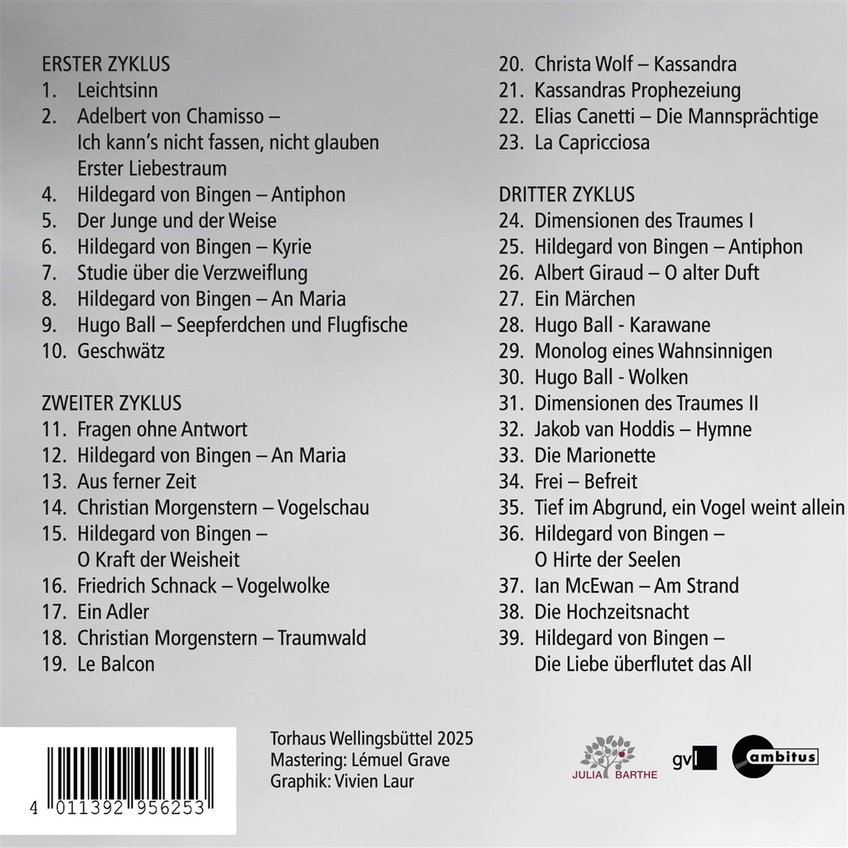 Das ‚Instrument des Jahres 2025‘ ist die menschliche Stimme. Aus diesem Grund präsentiert die deutsche Sängerin Julia Barthe eine Auswahl von A-cappella-Liedern, komponiert von Dimitri Terzakis (geb. 1938) und Hildegard von Bingen (1098–1179). Zwischen den Lebenszeiten dieser beiden Komponisten liegen mehr als 800 Jahre. Zwischen 1994 und 1996 schrieb Terzakis 18 kurze Monodramen mit dem Titel „Lieder ohne Worte”, darin unter anderem die Stücke „Sorglos”, „Klatsch”, „Ein Märchen” und „Monolog eines Verrückten”. Dimitri Terzakis hat als ‚Komponist zwischen zwei Welten‘ seine eigene Musiksprache entwickelt, deren Wurzeln in der Musikkultur Griechenlands und des östlichen Mittelmeerraums liegen. Terzakis ist jedoch keineswegs ein Epigone. Er nutzt technische Elemente aus alten Musiktraditionen, um eine einzigartige Form des musikalischen Ausdrucks zu schaffen, die sich durch horizontale Melodien auszeichnet. Dieser melodische Ansatz folgt nicht dem westlichen temperierten System, sondern verwendet Mikrointervalle, die kleiner als Halbtöne sind. Julia Barthe kombiniert die Lieder mit Hildegards gregorianischen Melodien und mit Texten und Gedichten von Christian Morgenstern, Hugo Ball (Dada), Elias Canetti und anderen. Julia Barthe, 1965 in Hamburg geboren, perfektioniert seit 45 Jahren ihre Stimme. In diesem Projekt verbindet sie ihre Vorstellung vom Singen mit ihrem Wissen über Musikwissenschaft, Violine und Literatur.