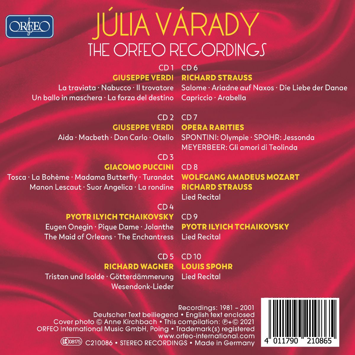 Anlässlich ihres 80. Geburtstags am 1. September 2021 ehrt das Label Orfeo die große Künstlerin Júlia Várady als eine der wichtigsten Sopranistinnen der zweiten Hälfte des 20. Jahrhunderts mit einer Zusammenstellung ihrer schönsten Einspielungen auf 10 CDs. Auf „The Orfeo Recordings“ sind Arien aus Opern von Mozart, Puccini, Strauss, Tschaikowski, Verdi und Wagner enthalten, ferner Raritäten von Spontini, Spohr und Meyerbeer sowie drei Lied-Recitals mit Werken von Spohr, Tschaikowski, Mozart und Strauss.