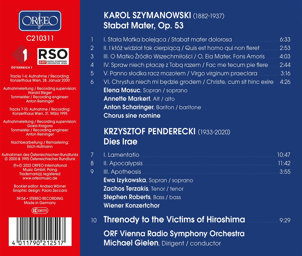 Bei aller Unterschiedlichkeit der Musiksprachen der auf dieser Aufnahme enthaltenen Werke der polnischen Komponisten Karol Szymanowski und Krzysztof Penderecki, verbindet sie doch ihre Eigenschaft als Klagegesang: Das 1926 von Szymanowski fertiggestellte Stabat mater, dem er nicht den lateinischen Originaltext des mittelalterlichen Gedichts, sondern eine polnische Übersetzung zugrunde legte, gilt bis heute als einer der wichtigsten Beiträge zur Musik des 20. Jahrhunderts. Pendereckis dreiteiliges Oratorium Dies Irae (1967) entstand als Auftrag für eine Gedenkfeier im ehemaligen Konzentrationslager von Auschwitz und ist dem Gedächtnis der dort Ermordeten gewidmet, weswegen es den Beinamen „Auschwitz Oratorium“ trägt.