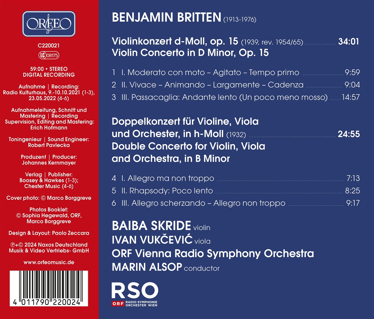 Benjamin Britten hatte sein Doppelkonzert für Violine und Viola schon in jungen Jahren begonnen, es aber nie ganz vollendet, obwohl das Werk schon weit fortgeschritten war. Erst nach seinem Tod wurde das Konzert von Colin Matthews vervollständigt und 1997 uraufgeführt. Im Gegensatz zu dieser späten Entdeckung wurde Brittens Violinkonzert op. 15 umgehend der Weltöffentlichkeit überantwortet und war schnell ein großer Erfolg für den englischen Komponisten. Die Geigerin Baiba Skride und Bratschist Ivan Vukcevic werden vom ORF Radio-Symphonieorchester Wien unter der Leitung von Marin Alsop begleitet.