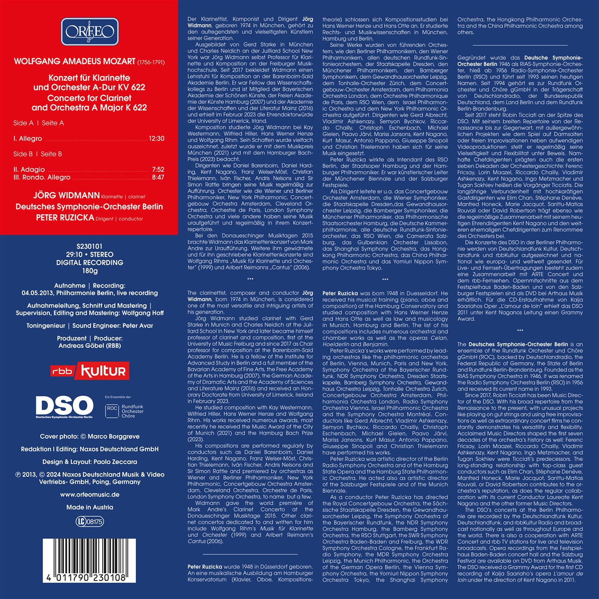 Der Klarinettist und Komponist Jörg Widman sagte in einem Interview, als Musiker könne man nicht distanziert von dem Stück sein, das man spielt, man müsse es sich zu eigen machen. Je nach eigener Verfassung oder beispielsweise als Reaktion auf das Orchester unterscheide sich seine Darbietung immer wieder. Natürlich innerhalb des Rahmens, den der Komponist festgelegt hat – und diese Balance zwischen eigener Interpretation und Werkstreue beherrscht er meisterhaft. Wolfgang Amadeus Mozarts Klarinettenkonzert spielt er immer wieder. Die 2013er-Aufnahme mit dem Deutschen Symphonie-Orchester Berlin unter dem Dirigenten (und Komponisten) Peter Ruzicka war eine besondere Sternstunde, die jetzt als exklusive Vinyl-Ausgabe erscheint.