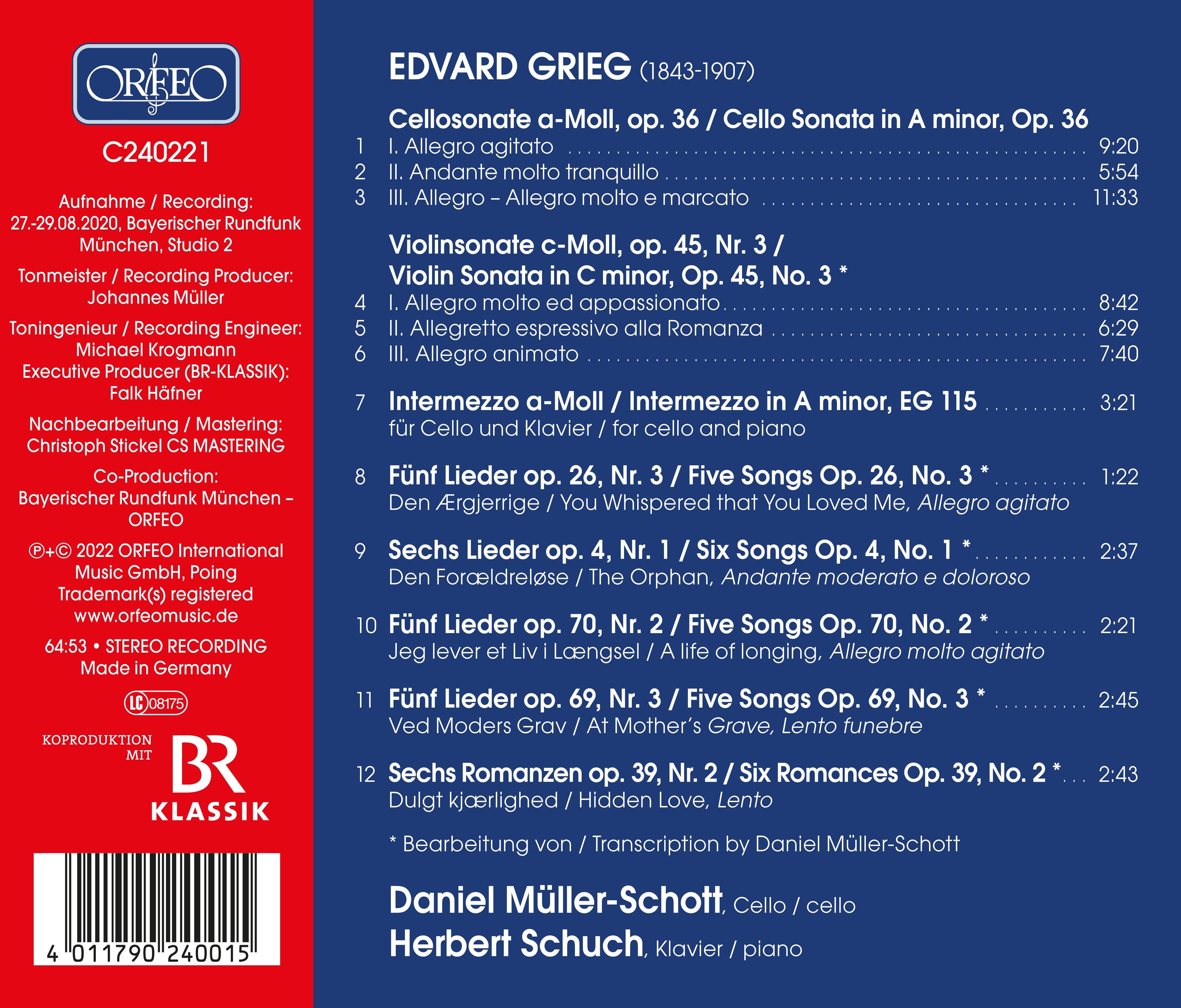 Edvard Grieg – bis heute der bekannteste Komponist der skandinavischen Halbinsel – trug eher mit seinen Violin-Sonaten zum gängigen Kammermusikkanon bei denn mit seinen Werken für Cello: Aus seiner Feder stammt lediglich die Sonate für Cello und Klavier, op. 36. Daniel Müller-Schott, der in früheren Einspielungen bereits sein Können und Gespür für Transkriptionen erwies, stellt auf seinem 20. Album beim Label Orfeo dieser Cello-Sonate die Transkription der Violinsonate in C-Moll, op. 45, Nr. 3, an die Seite. Am Klavier begleitet von seinem langjährigen Duo-Partner Herbert Schuch, leitet das kurze Intermezzo in A-Moll (EG 115) zum zweiten Teil des Albums über, in dem das Duo ausgewählte Lieder verschiedenen Charakters in Transkription für Cello und Klavier präsentiert.