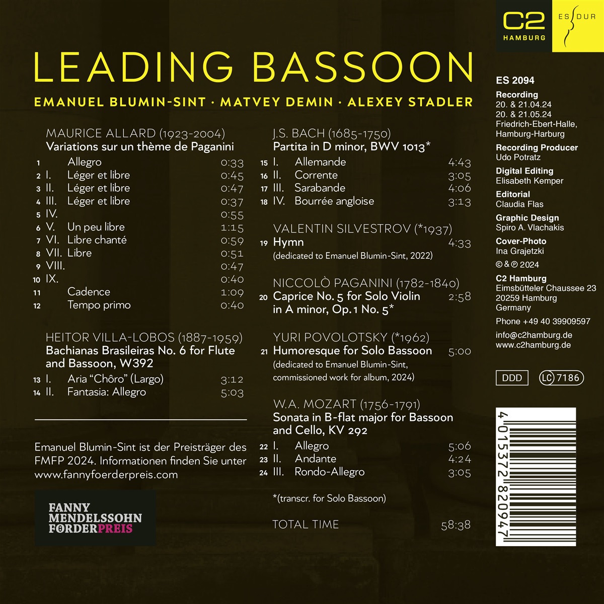 Capricen von Paganini auf dem Fagott? „Ja, das geht“, sagt der junge Fagottist Emanuel Blumin-Sint. Im September 2024 veröffentlicht der Gewinner des Fanny Mendelssohn Förderpreises 2024 sein Debüt-Album beim Label ES-DUR. Mit „Leading Bassoon“ demonstriert Emanuel Blumin-Sint die vielfältigen Möglichkeiten des Fagotts und erweitert das Repertoire und die Spieltechnik. Es ist sein grosser Wunsch, das Fagott als führendes Solo-Instrument zu etablieren. Auf seinem Album kombiniert er die Werke von Bach, Mozart, Paganini, Allard und Villa-Lobos mit zeitgenössischen Kompositionen von Yuri Povolotsky und Valentin Silvestrov, die ihm gewidmet sind. In Silvestrovs Komposition übernimmt Emanuel selbst die Pedalierung am Klavier. Der Flötist Matvey Demin und der Cellist Alexey Stadler sind Emanuels Partner in den Duo-Werken.